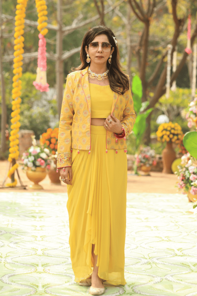 The Aarunya Drape Set is a celebration of soft sophistication and festive luminosity, designed in a radiant yellow hue that exudes warmth and effortless elegance. The ensemble features a gracefully draped dhoti skirt with fluid pleats, paired with a sleek blouse that creates a refined and contemporary silhouette. It is layered with a delicately tailored jacket adorned with subtle motifs and fine hand-finished detailing along the cuffs and edges, adding a touch of understated craftsmanship. Presented by the designer herself, this ensemble reflects the essence of Rosy Ahluwalia’s design language elegant, feminine, and timeless with a modern festive appeal. Perfect for haldi ceremonies, daytime celebrations, and intimate festive gatherings where comfort meets elevated style.