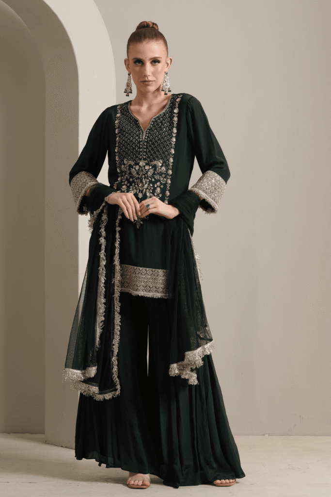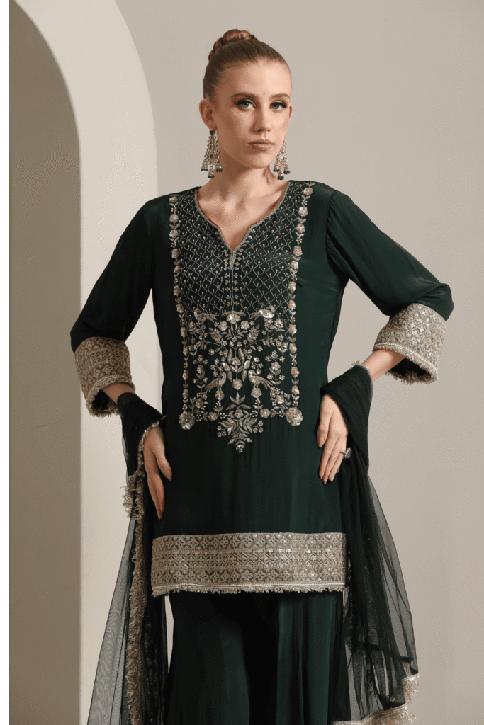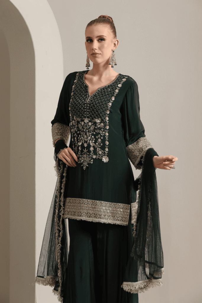 Tailored in soft crepe, the suit features intricate embroidery highlighted with a broad lace border along the sleeves and hem, lending a regal finish. It is paired with a delicate net dupatta, accentuated with kinari lace for a subtle festive touch. A graceful ensemble that balances sophistication with tradition