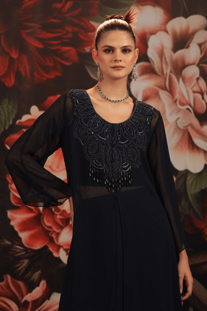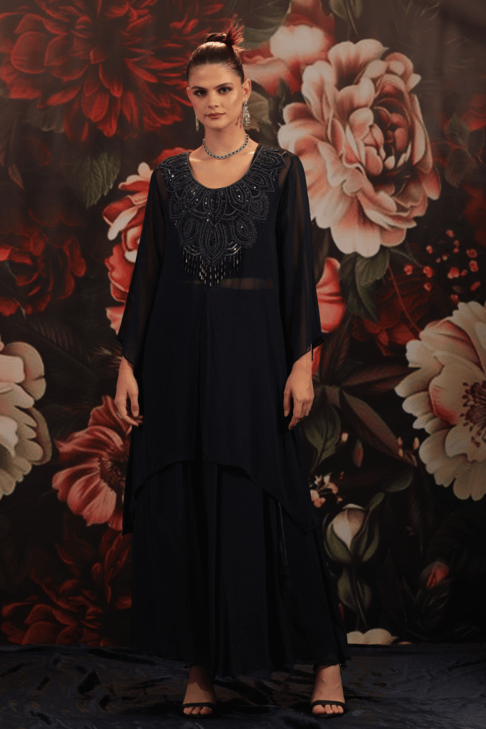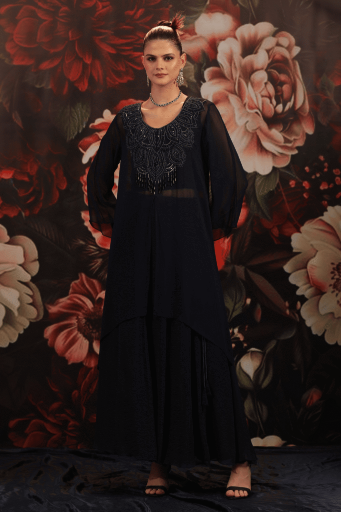 Crafted in deep navy blue, the A-line top is adorned with meticulous tone-on-tone hand embroidery along the neckline—subtle yet regal.