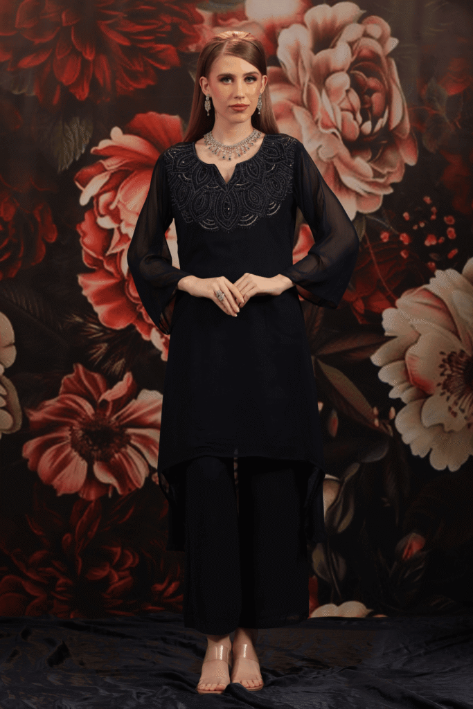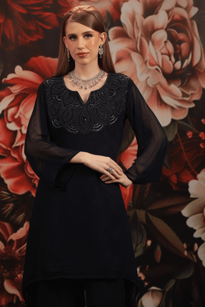 An elegant navy blue co-ord set crafted for modern sophistication. The top features intricate embroidery along the neckline with sheer flared sleeves, adding a touch of delicacy. It is paired with flowing palazzo pants that bring effortless movement and grace. Perfect for festive soirées or refined gatherings, this ensemble captures Rosy Ahluwalia’s signature balance of timeless elegance and contemporary charm.