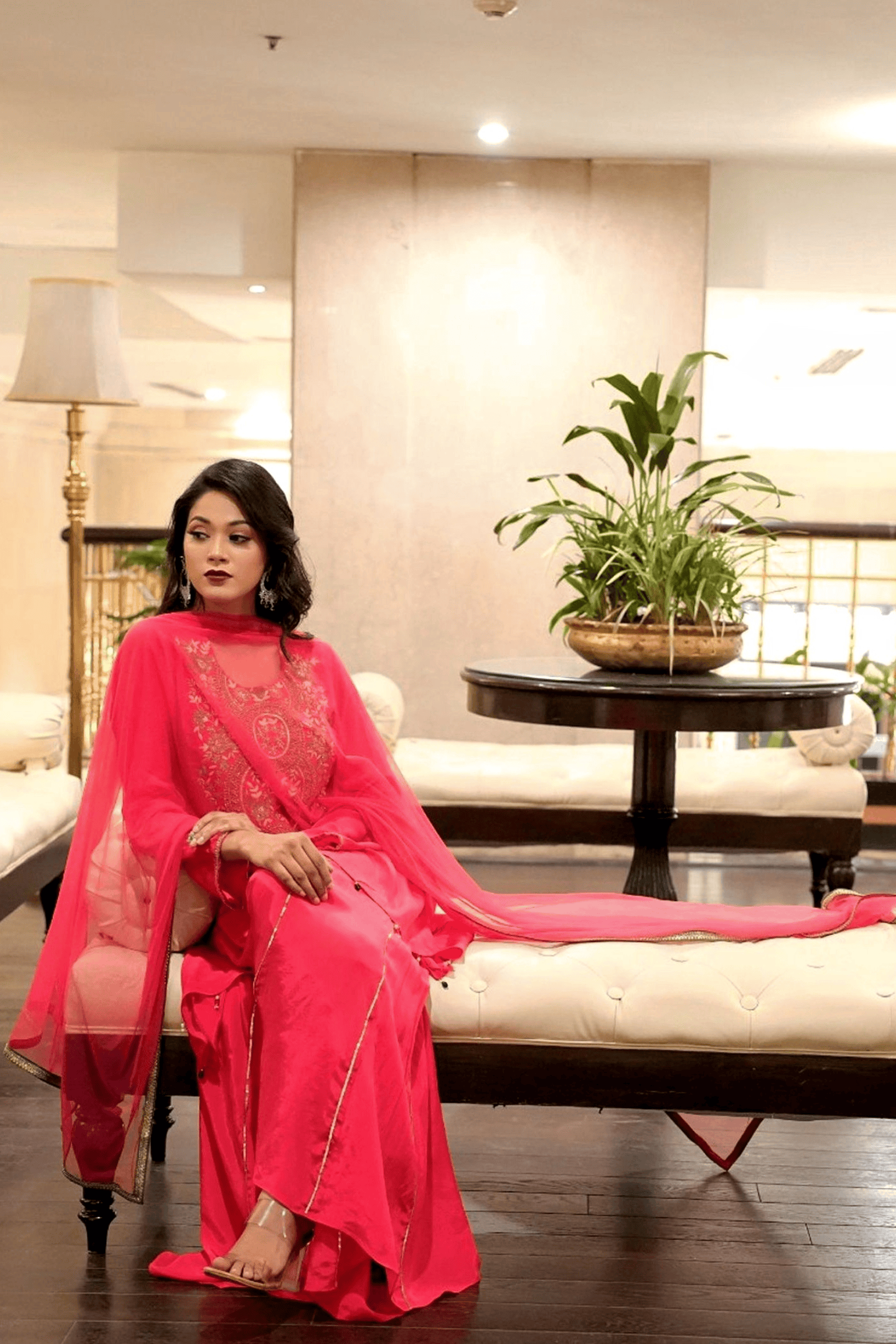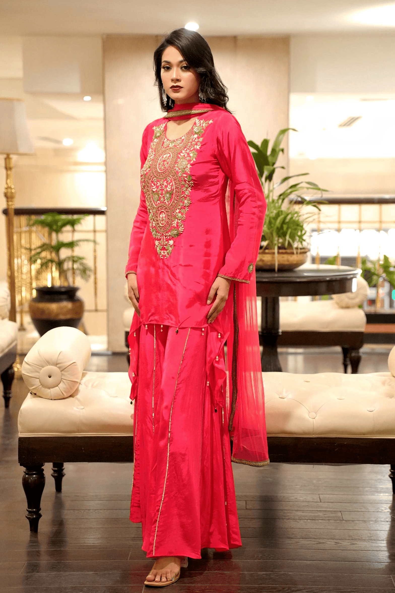 The Falak Suit Set is a radiant expression of festive elegance in a striking hot pink hue. Intricately adorned with zari embroidery in pani gold, accented by hints of olive green, this ensemble exudes refined charm. It comes paired with palazzo bottoms featuring sequin lines along the kalis, and a soft pink net dupatta finished with delicate lace on all four sides. A perfect blend of vibrance and grace.