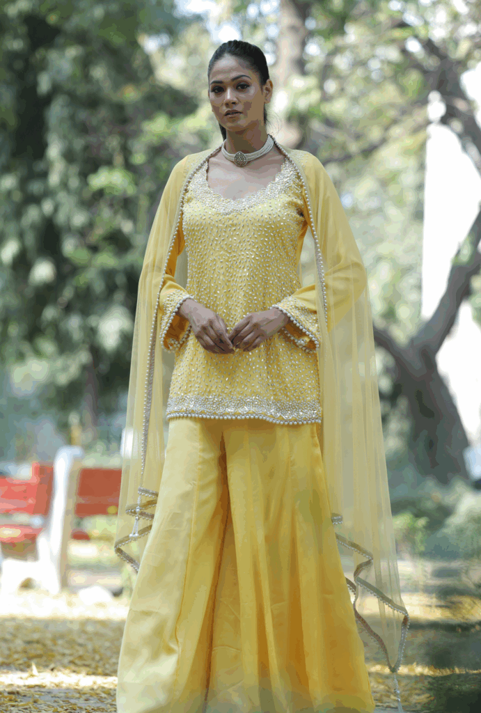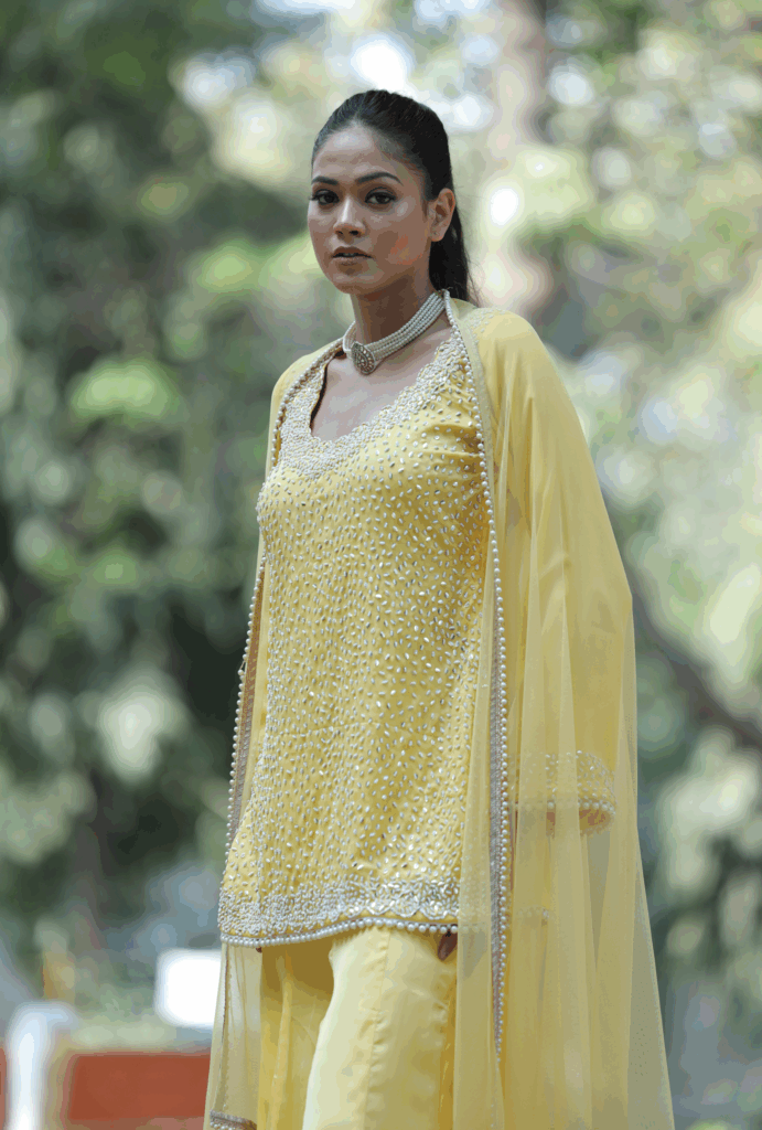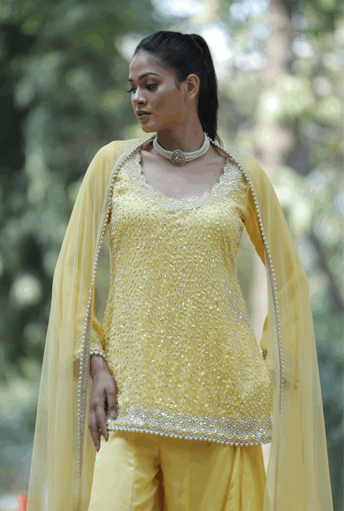Lemon yellow sharara suit set that captures the essence of summer elegance.The kurta is adorned with intricate pearl hand embroidery, adding a subtle sheen and delicate texture. Paired with a flared sharara and a light, flowing dupatta, this ensemble is perfect for daytime festivities, mehendi celebrations, or intimate gatherings where timeless charm meets modern femininity.