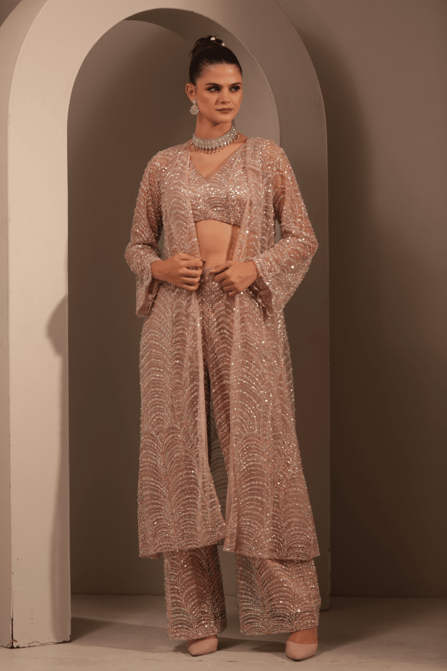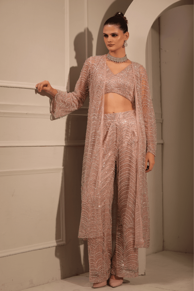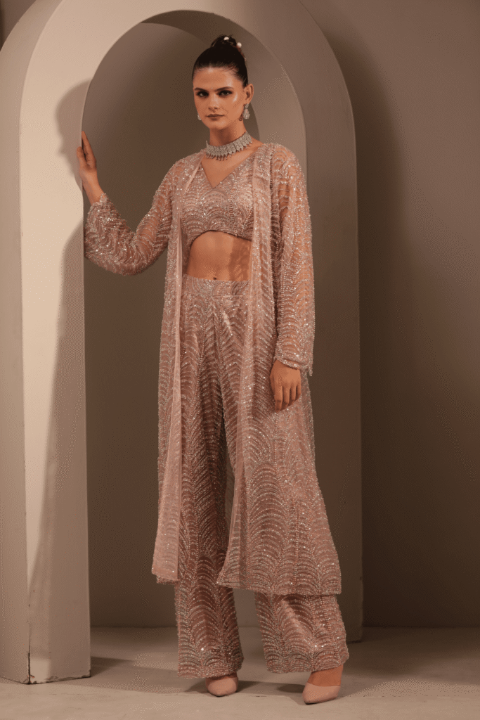 The set features a contemporary V-neck blouse with a flattering cut that perfectly balances glamour and ease. Wide-legged, flowing pants mirror the blouse’s intricate detailing, offering movement and grace with every step. A sheer longline cape, drenched in matching sequins, completes the look—adding drama, dimension, and celestial charm