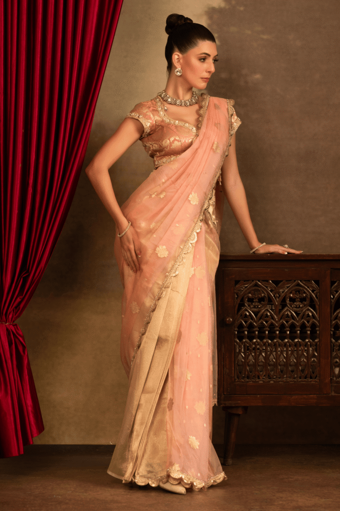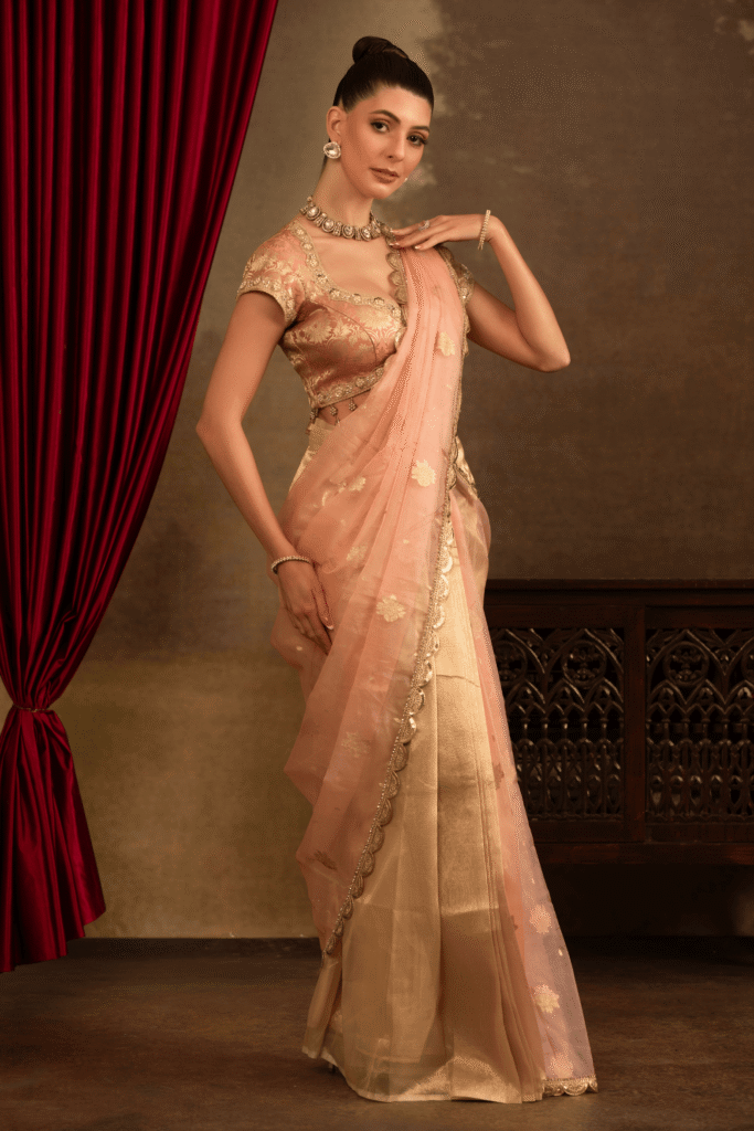 The Gulrang Satrangi Saree Set is crafted in a soothing palette of blush peach and antique gold. The saree is designed in airy organza tissue, adorned with subtle zari motifs that lend a gentle shimmer. Its finely scalloped embroidered border adds a touch of heritage artistry. Paired with a structured brocade silk blouse. he blouse’s detailed finish at the neckline and sleeves.