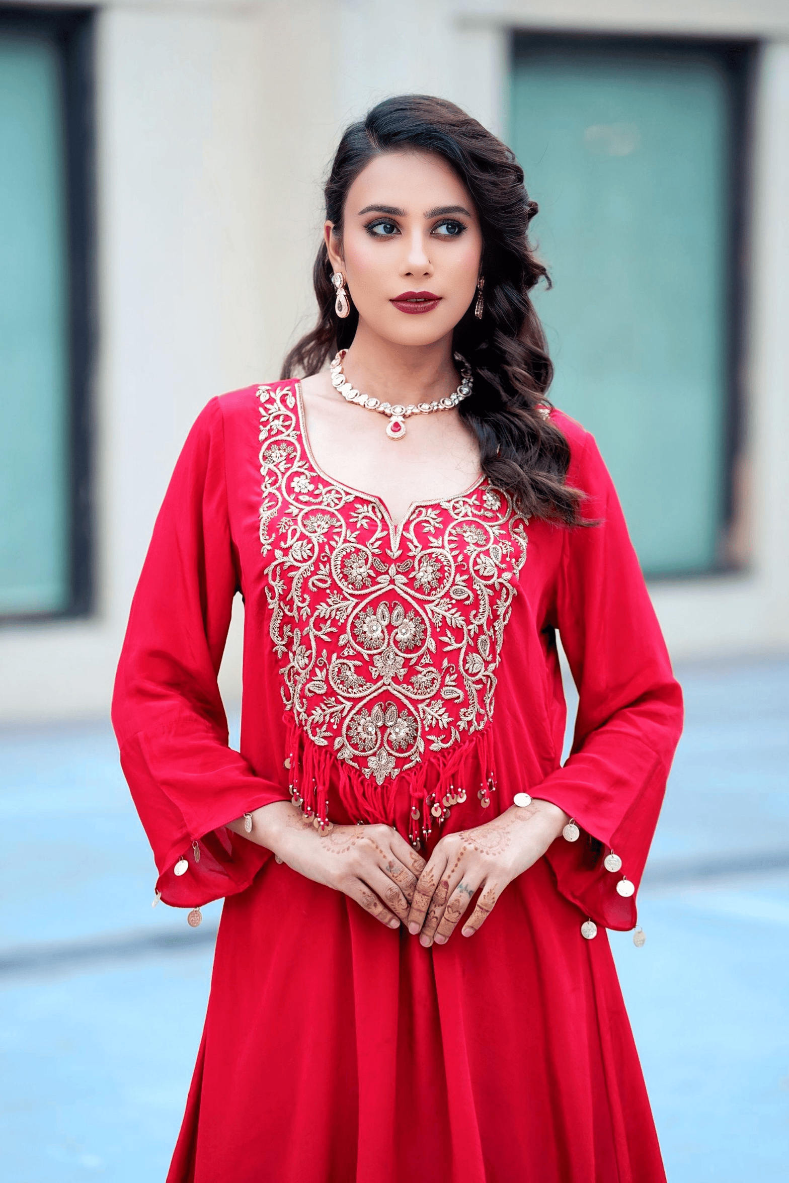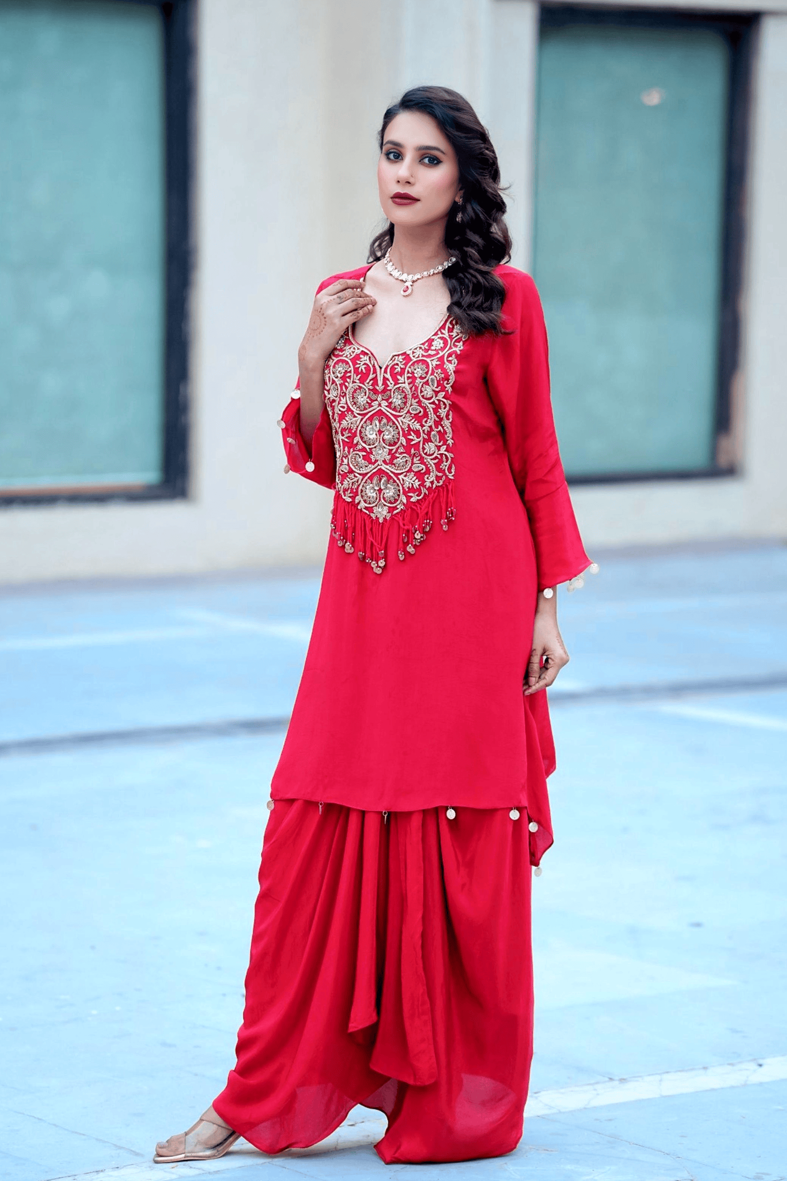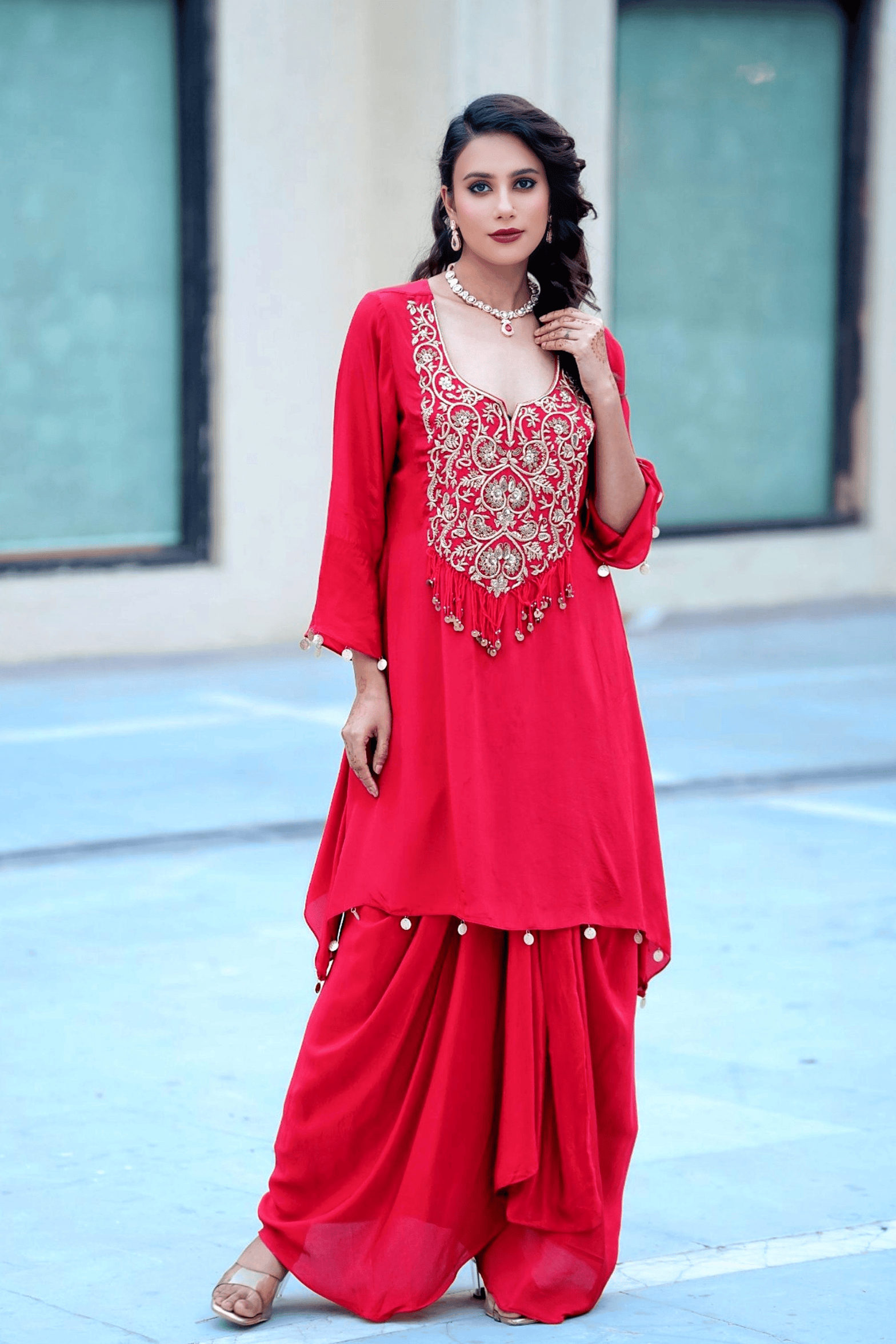 This vibrant red dhoti set exudes festive elegance. The kurta features exquisite zardozi embroidery along the neckline, accentuated with delicate tassels and coin detailing on the hem and sleeves. Paired with a pre-draped dhoti, this look beautifully merges traditional artistry with contemporary ease.