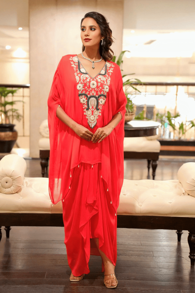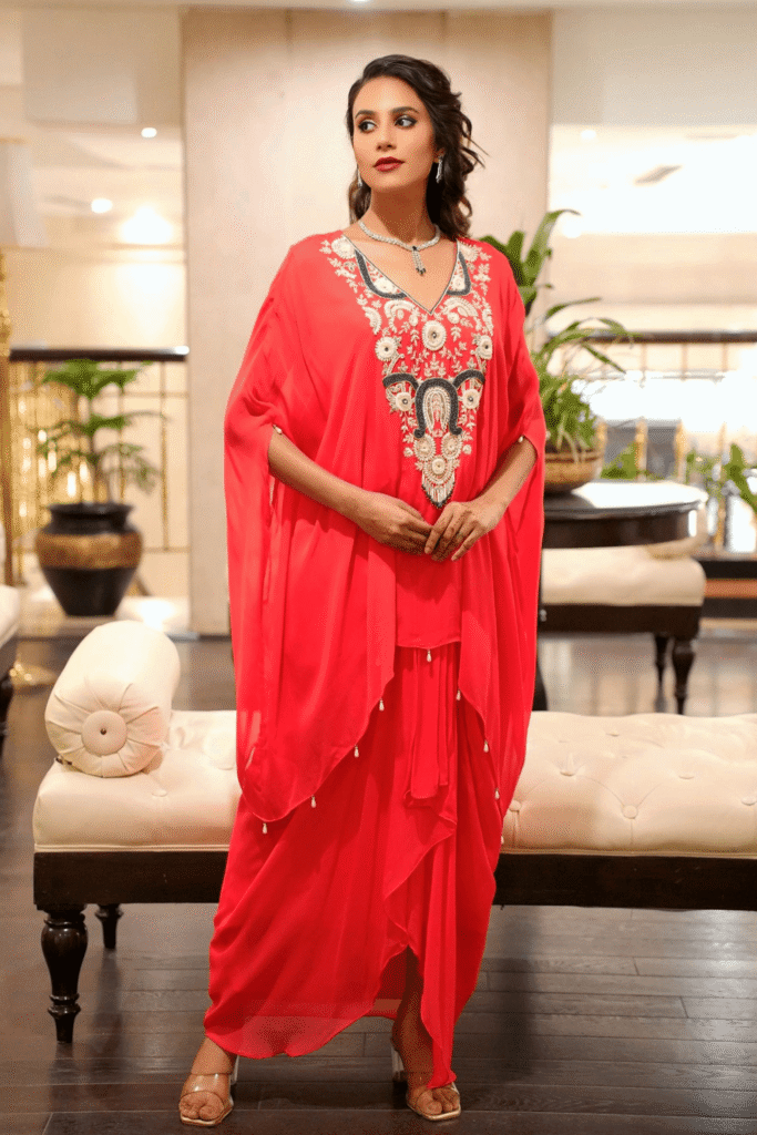 The Inaaya Dhoti Set in striking hot pink georgette blends effortless style with intricate craftsmanship. The kaftan-style top is beautifully hand-embroidered with moti work, featuring delicate dark green bead highlights for a refined contrast. Finished with matching latkans on the hem and sleeves, and paired with a pre-draped dhoti.