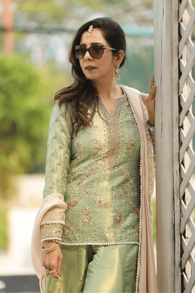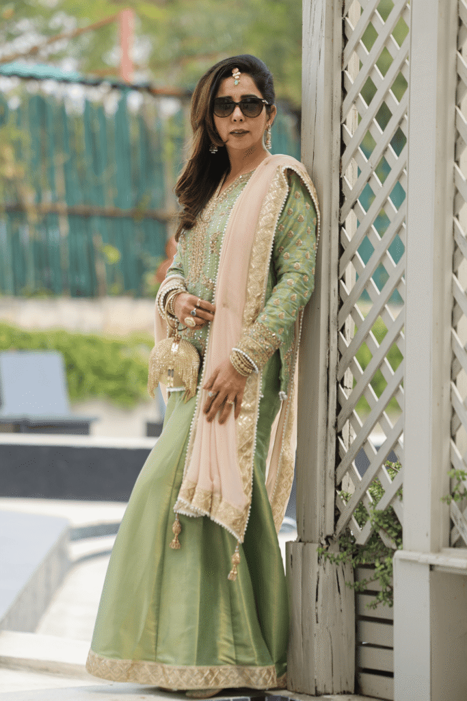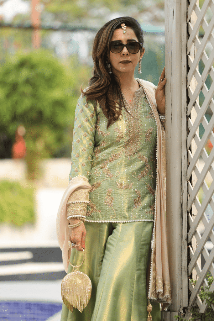 Designer Rosy Ahluwalia is wearing the Meheraan Lehenga Set. The outfit features a beautifully hand-embroidered kurta adorned with delicate gold embellishments and intricate detailing along the neckline and sleeves. It is paired with a flowing palazzo. The look is completed with a sheer dupatta highlighted by an ornate zari border and tassel accents, lending a sophisticated finish. Perfect for daytime festivities, intimate celebrations, and elegant occasions, this ensemble reflects Rosy Ahluwalia’s signature aesthetic of understated luxury, fine craftsmanship, and modern Indian elegance.