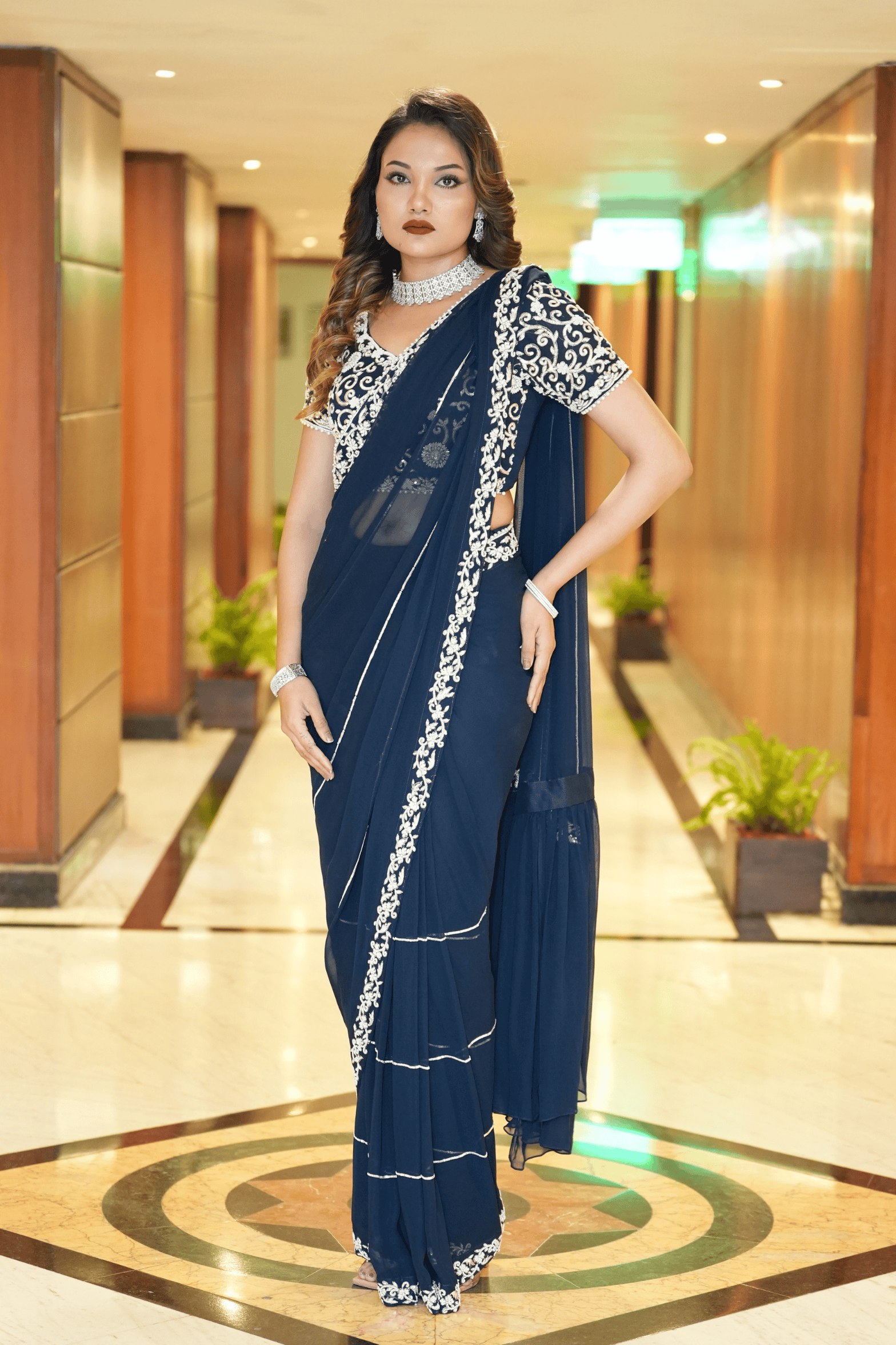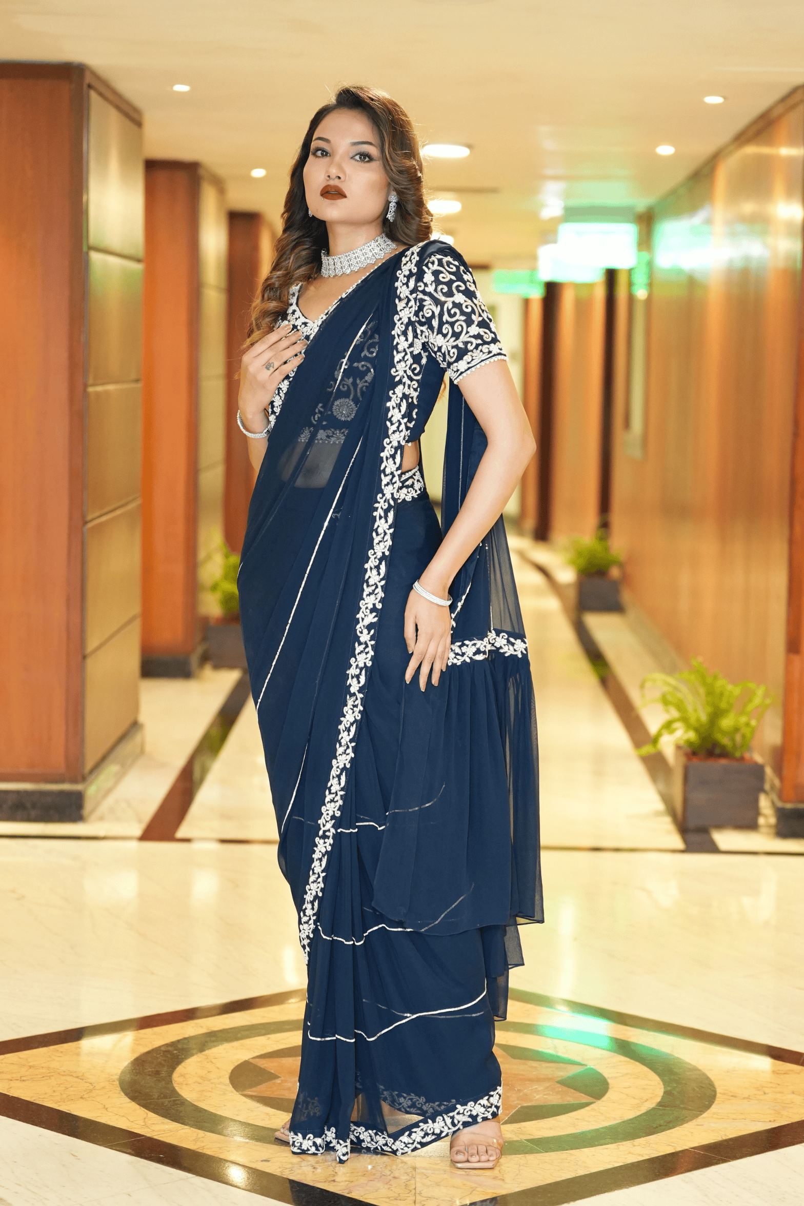 Crafted in a luxurious navy georgette, this pre-draped saree features delicate white thread embroidery along the borders and blouse, creating a striking contrast against the deep hue. The intricate detailing and fluid drape evoke an aura of refined elegance and timeless charm.