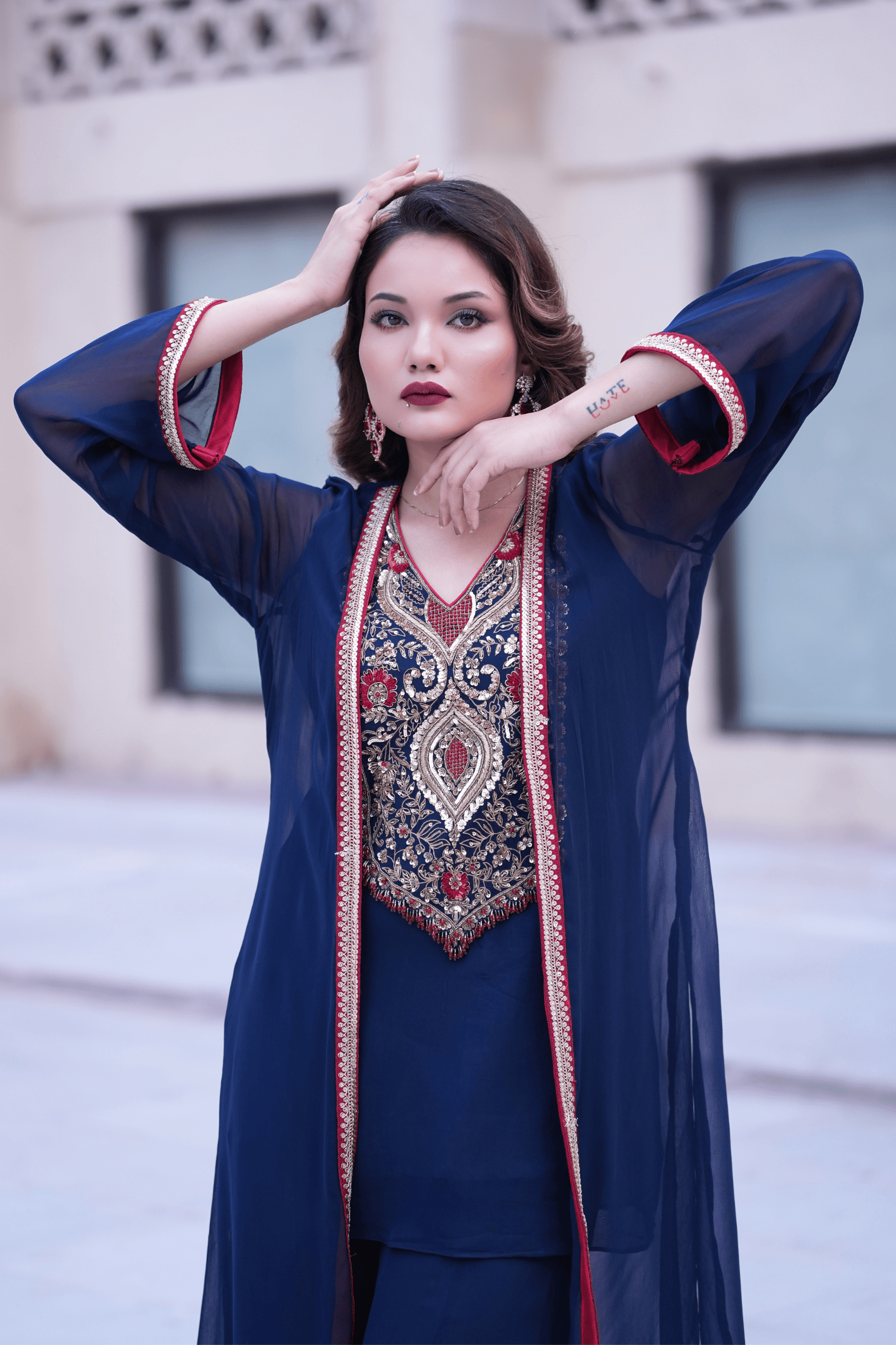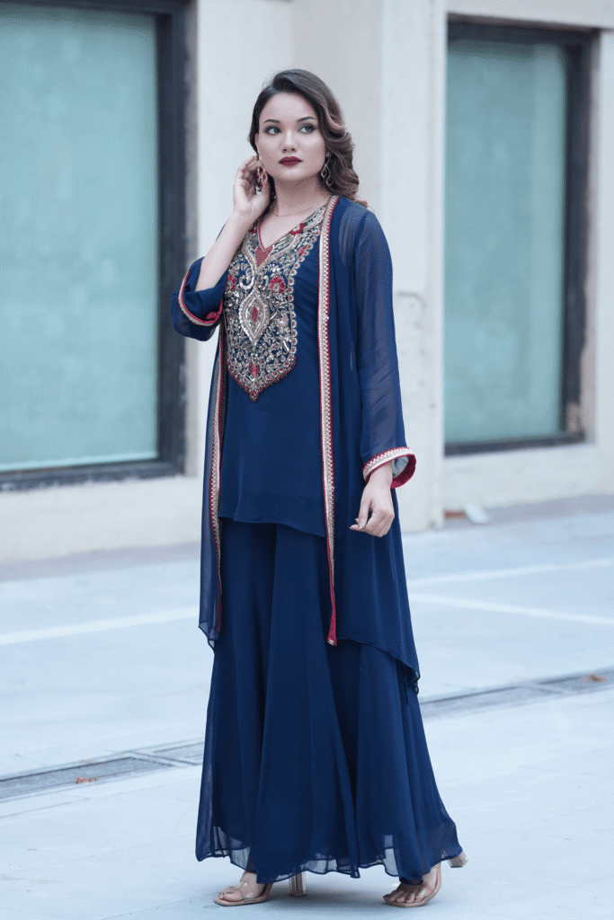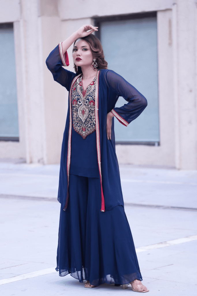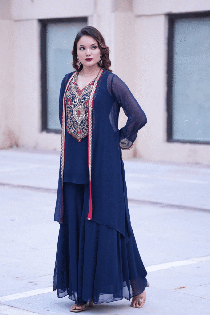 A timeless ensemble in deep navy blue georgette, Nayab features an intricately hand-embroidered kurta adorned with zardozi and sequin detailing in shades of gold, red, and blue. The sheer overlay jacket, lined with contrast red piping, adds fluid elegance to the silhouette. Paired with a flared sharara in matching georgette, this ensemble blends regal craftsmanship with effortless sophistication — perfect for festive evenings or formal gatherings.