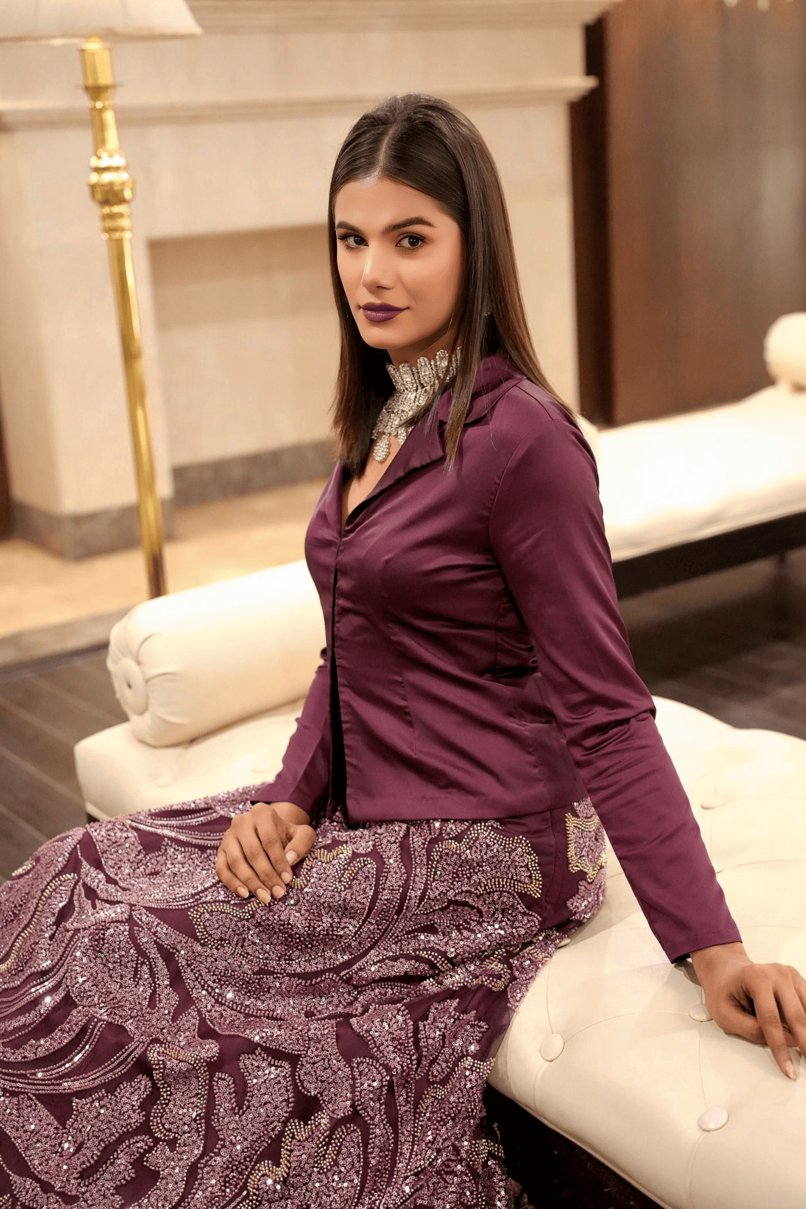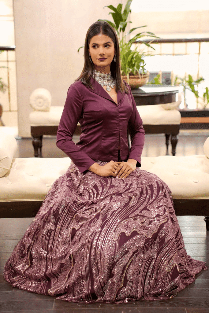 Crafted in a deep wine georgette, this hand-embroidered lehenga features intricate sequin detailing that shimmers with moonlit grace. Paired with a matching blouse and a slender stole, it embodies understated luminosity and timeless poise.