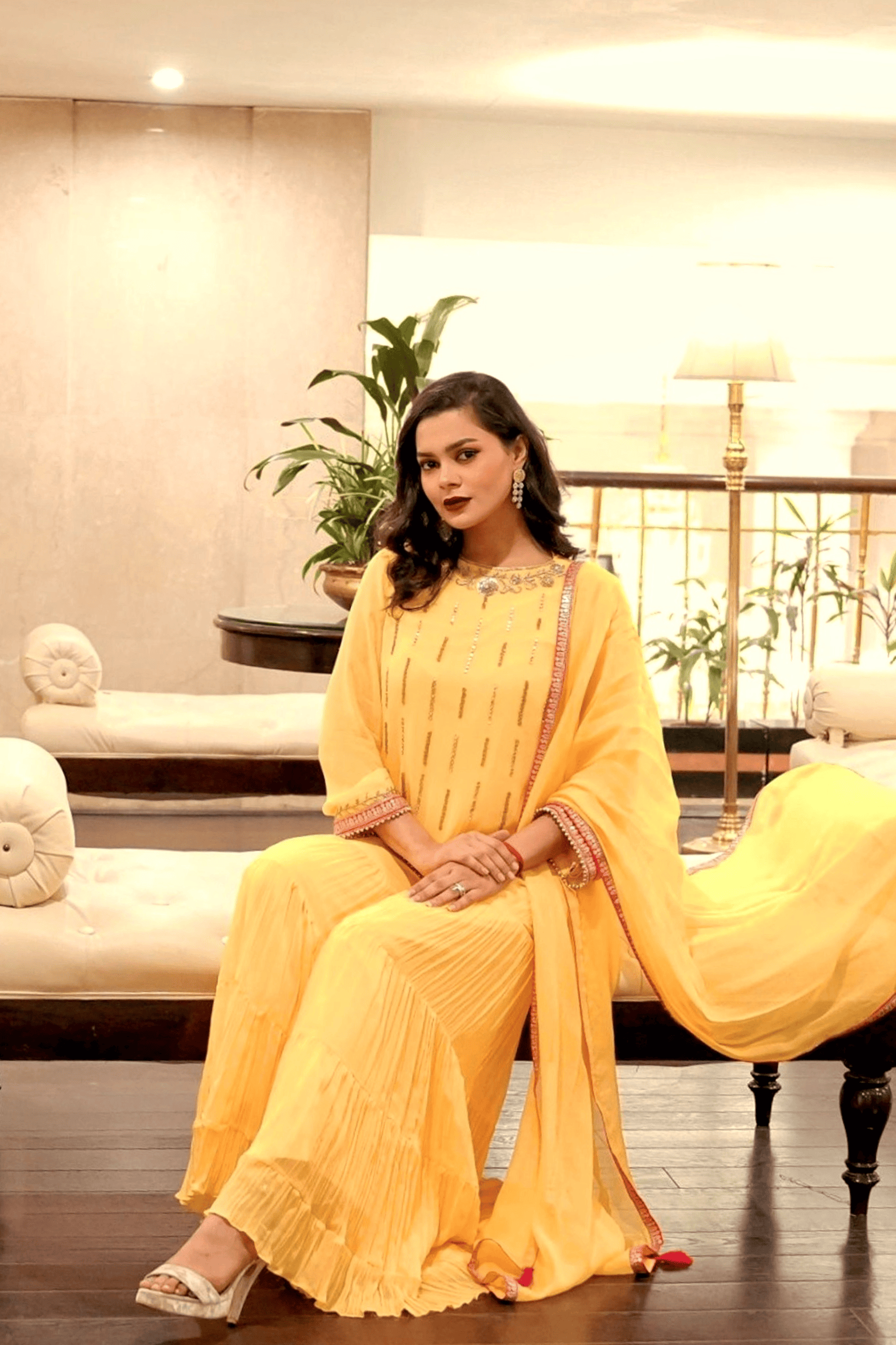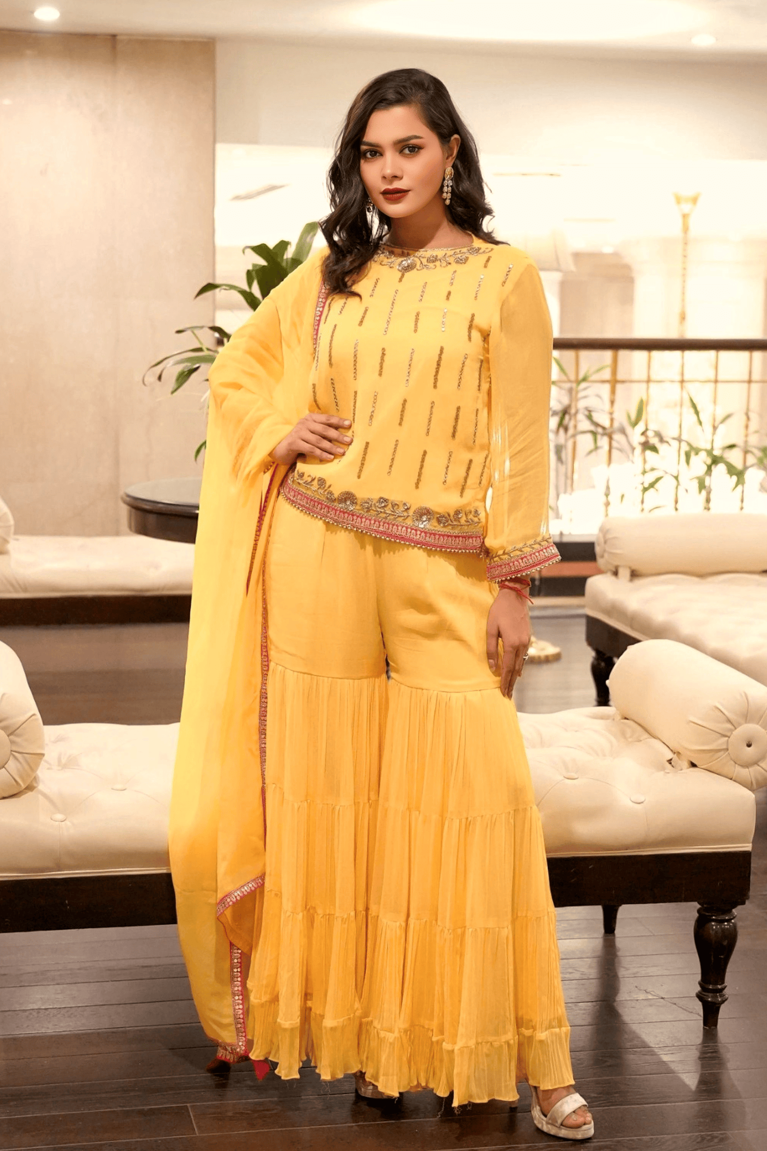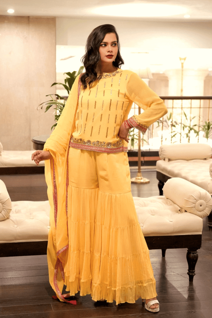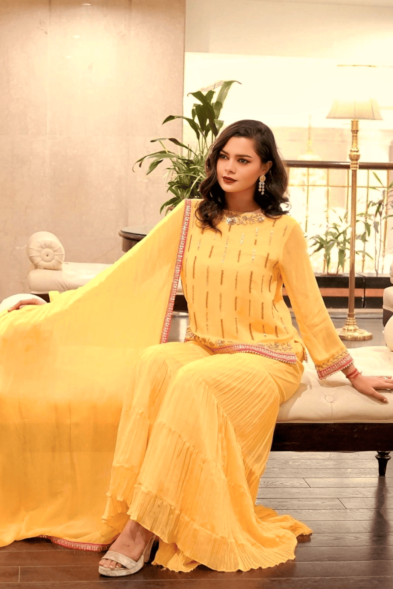 The short kurta is intricately embellished with all-over zari embroidery, highlighted by pink lace detailing on the hem and sleeves. It is paired with a gathered sharara that adds graceful movement, and a light organza dupatta edged with pink lace for a touch of contrast. Bright, feminine, and timeless.