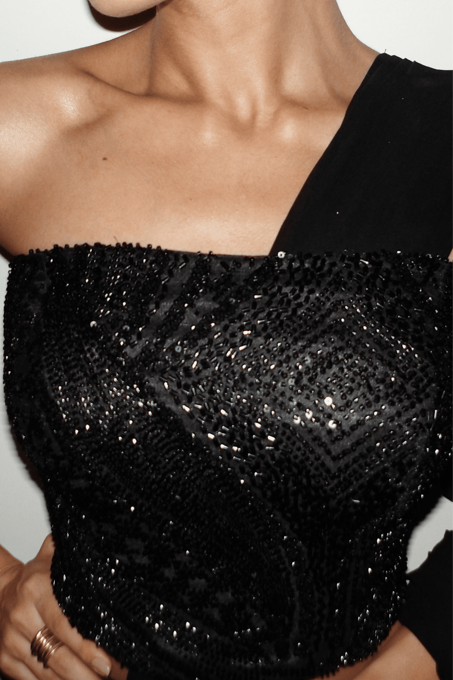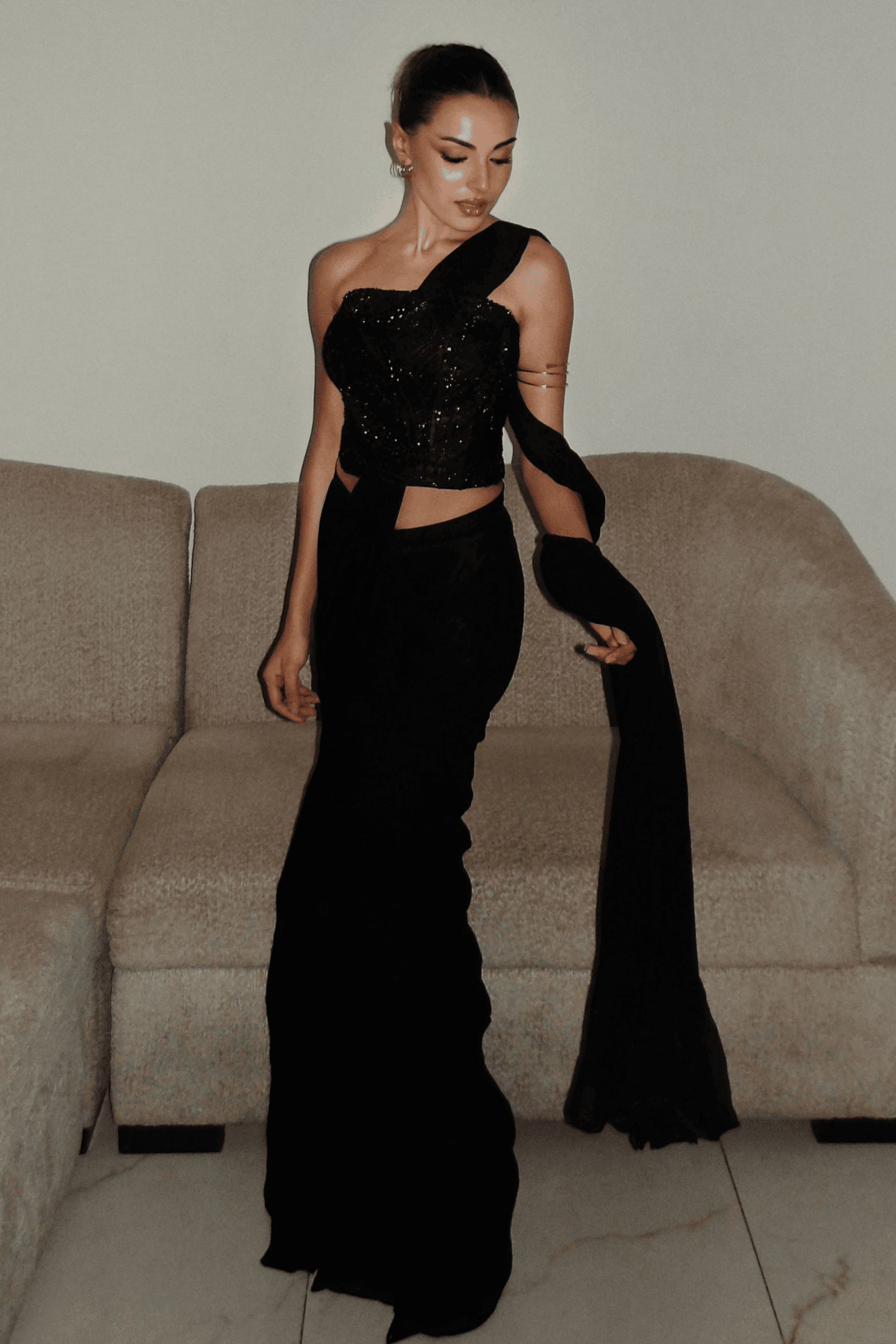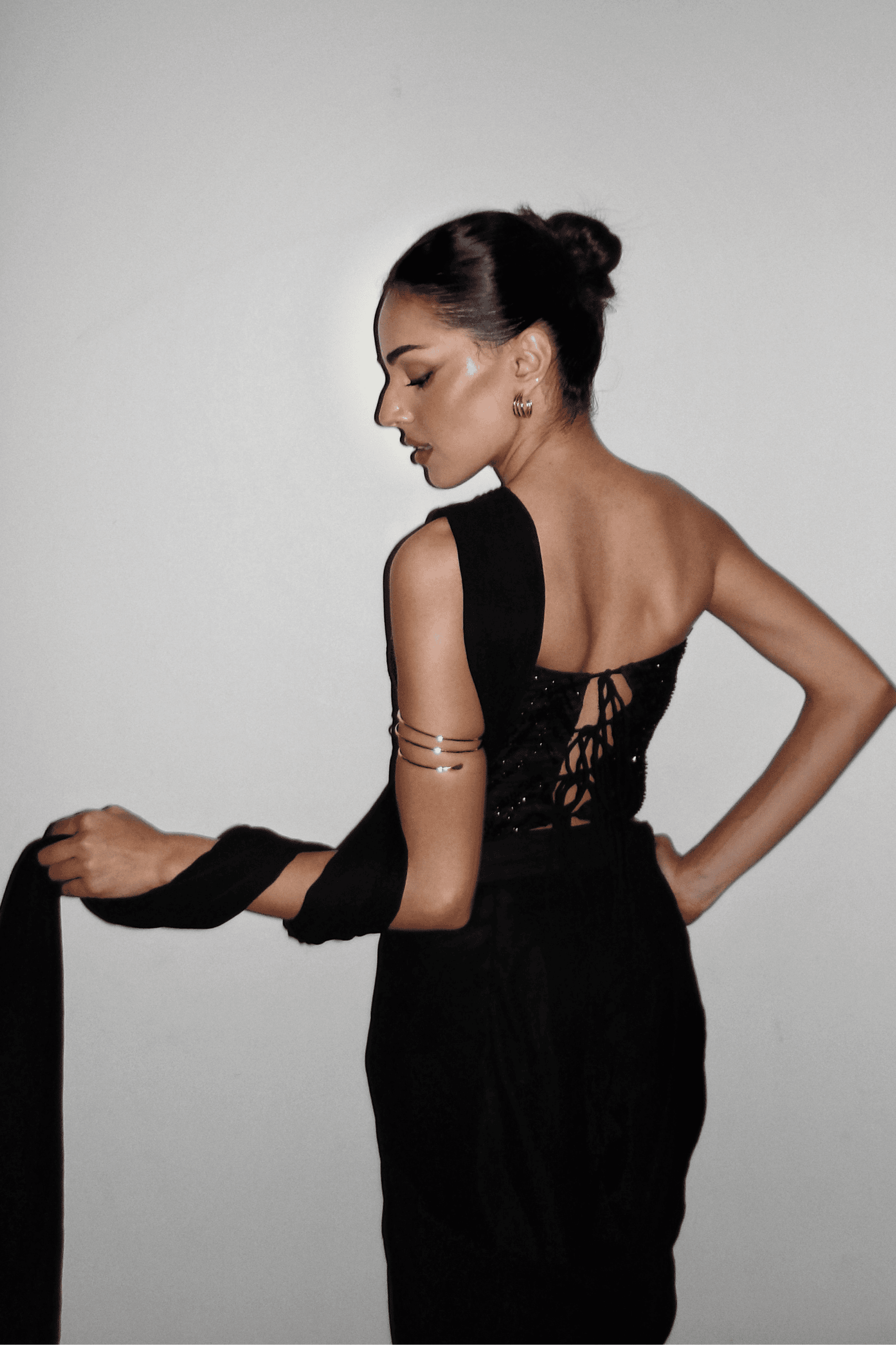 Introducing the Serpentine Sari, a fusion of craftsmanship and modern allure. The intricately hand embroidered corset is draped in a serpentine flow, creating a bold statement.