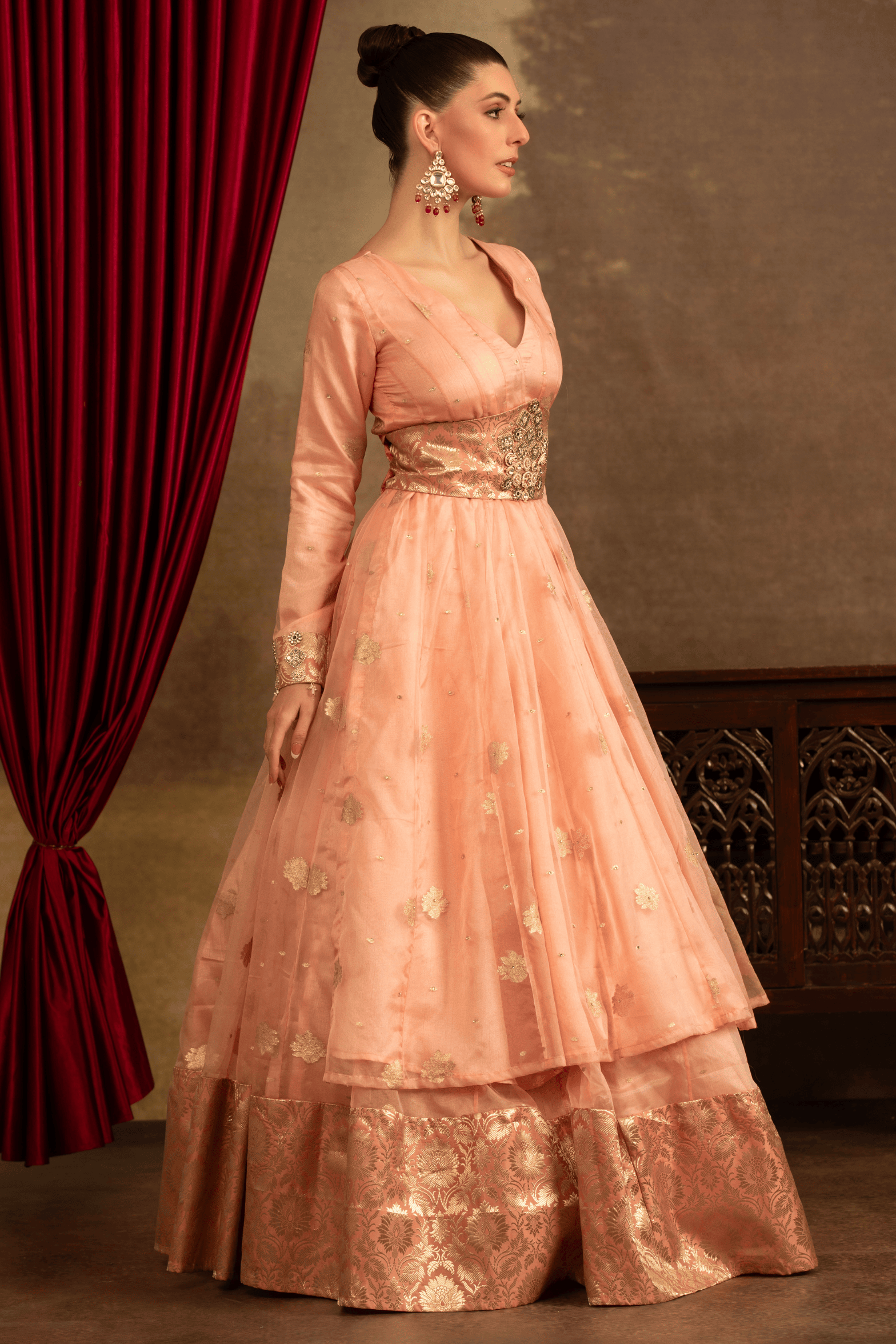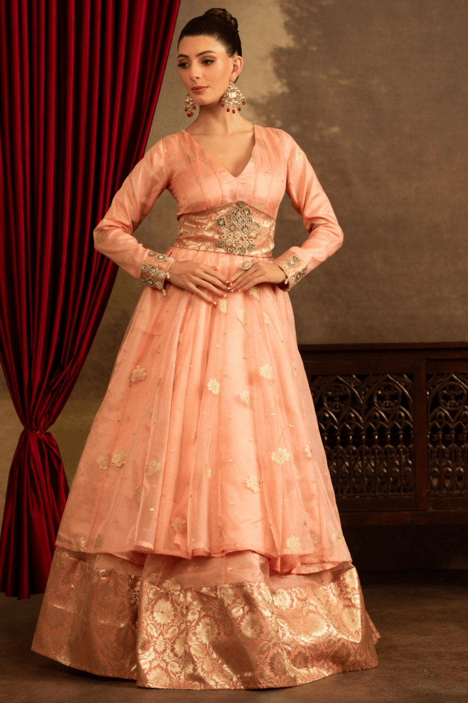 The Peach Noor Embellished Lehenga Set from the Satrangi collection by Rosy Ahluwalia is a soft peach palette, this ensemble captures the essence of understated luxury. The look features a voluminous lehenga crafted with a sheer organza overlay, delicately adorned with scattered gold motifs. Beneath, a rich brocade layer adds depth and a regal finish, enhancing the overall richness of the silhouette.