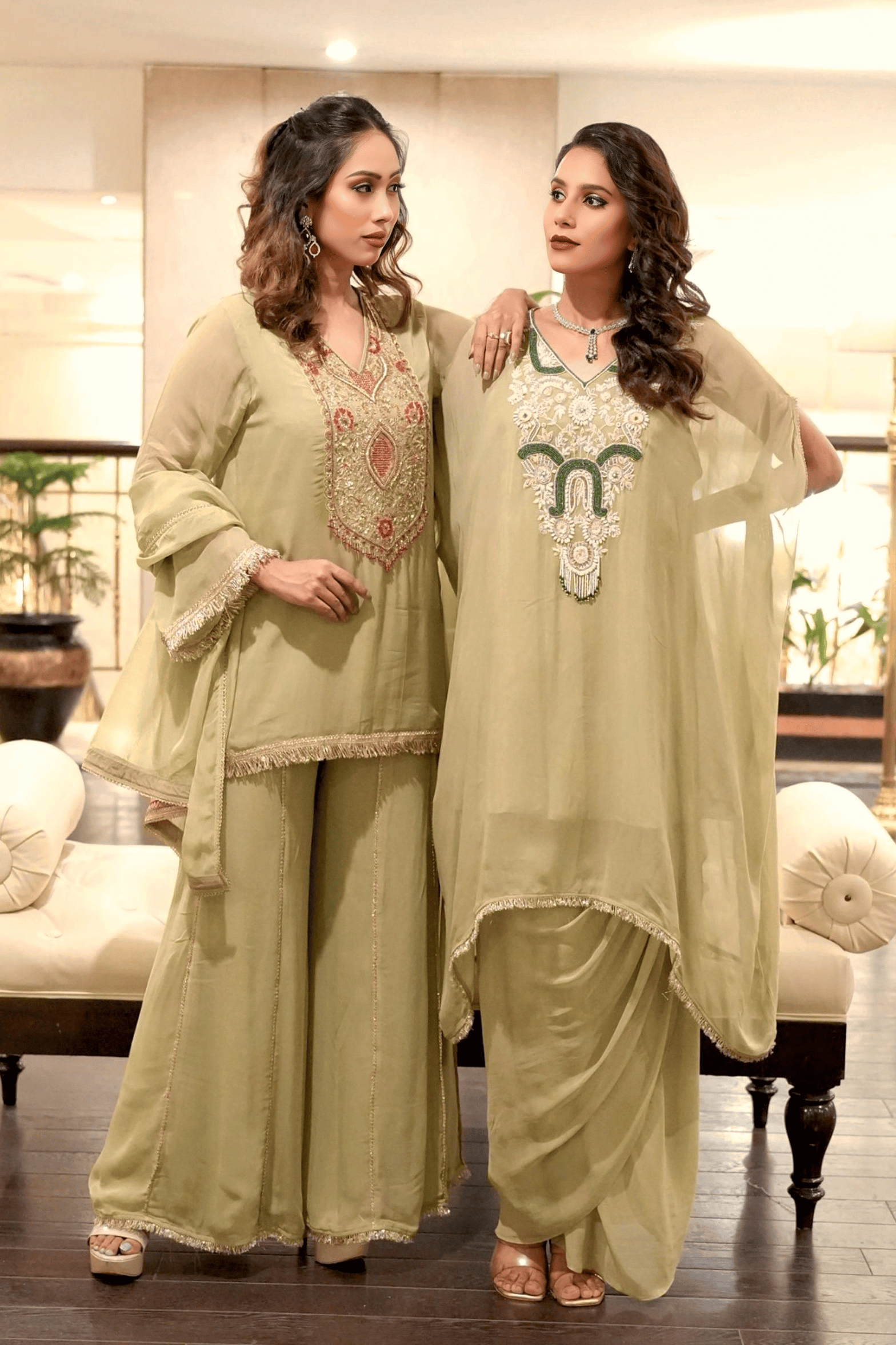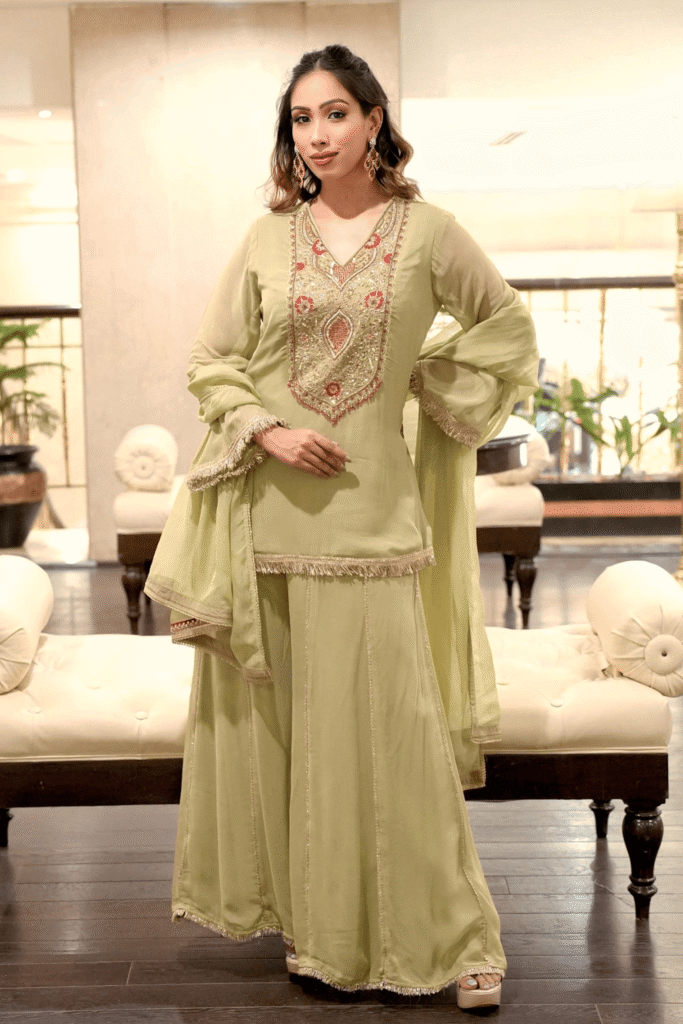 The Rizwa Suit Set is a timeless olive green ensemble crafted in flowing georgette fabric. The kurta is adorned with intricate zari embroidery, highlighted by subtle hot pink hand-threadwork for a graceful contrast. Delicate kinari lace detailing along the hem and sleeves adds a traditional touch. Paired with elegant palazzos and a soft organza dupatta, this look embodies effortless sophistication with festive charm.