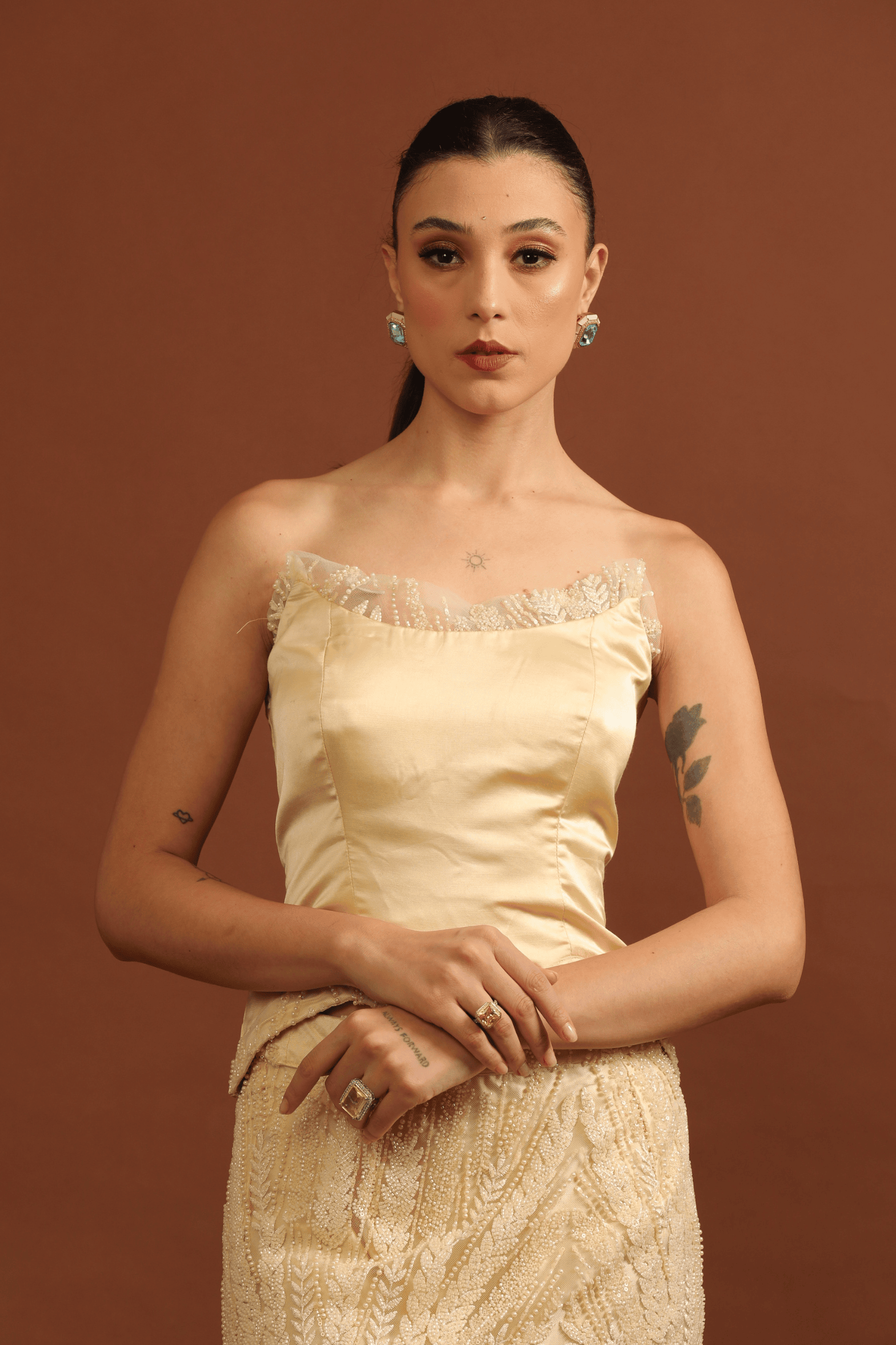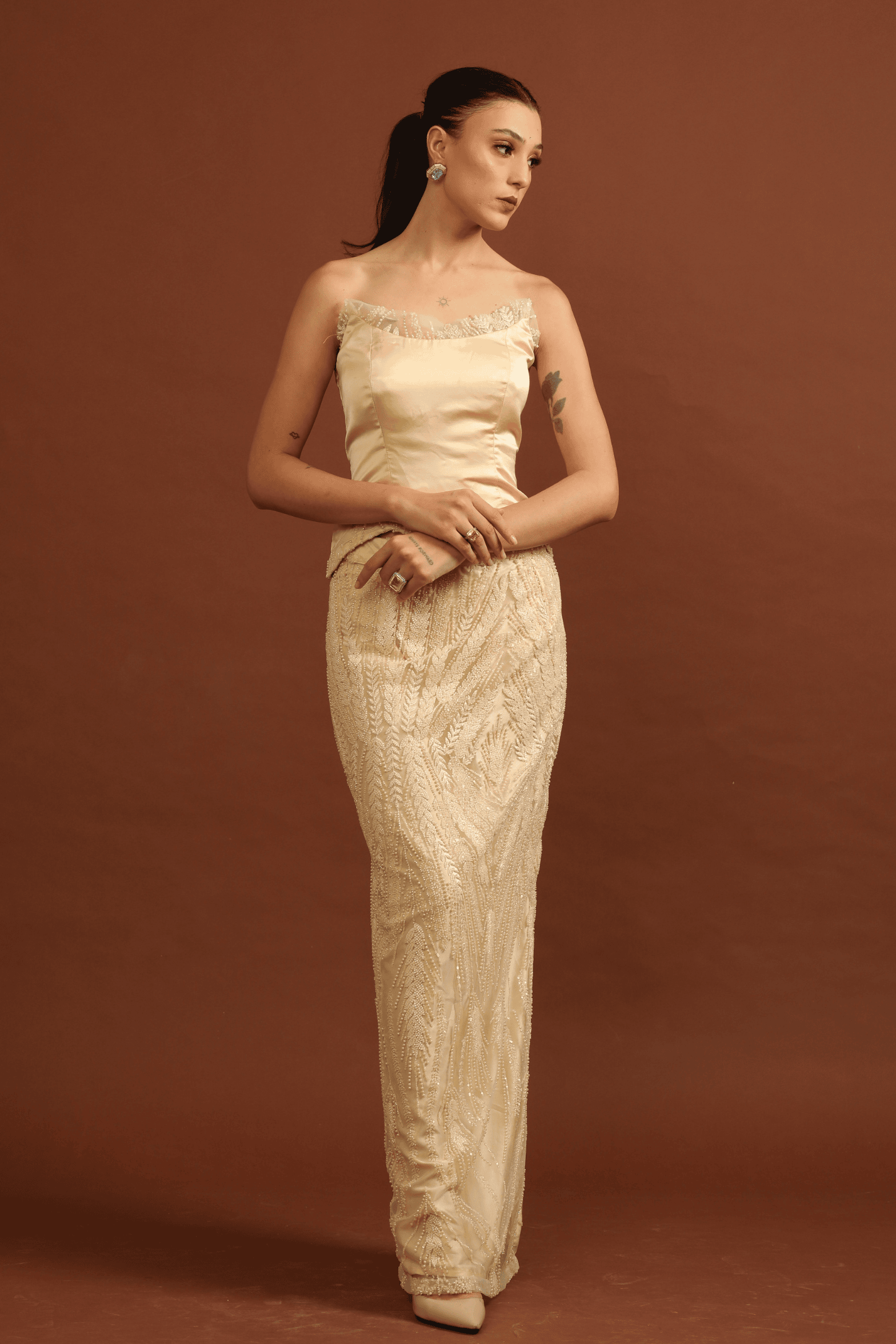 The Rohini Corset Lehenga Set from the Sitare collection is crafted in a sleek fish-cut silhouette, bringing a contemporary edge to classic couture. The plain, structured corset blouse offers a clean and modern balance, while the lehenga shimmers with exquisite all-over pearl embroidery, creating a luminous, sculpted look.