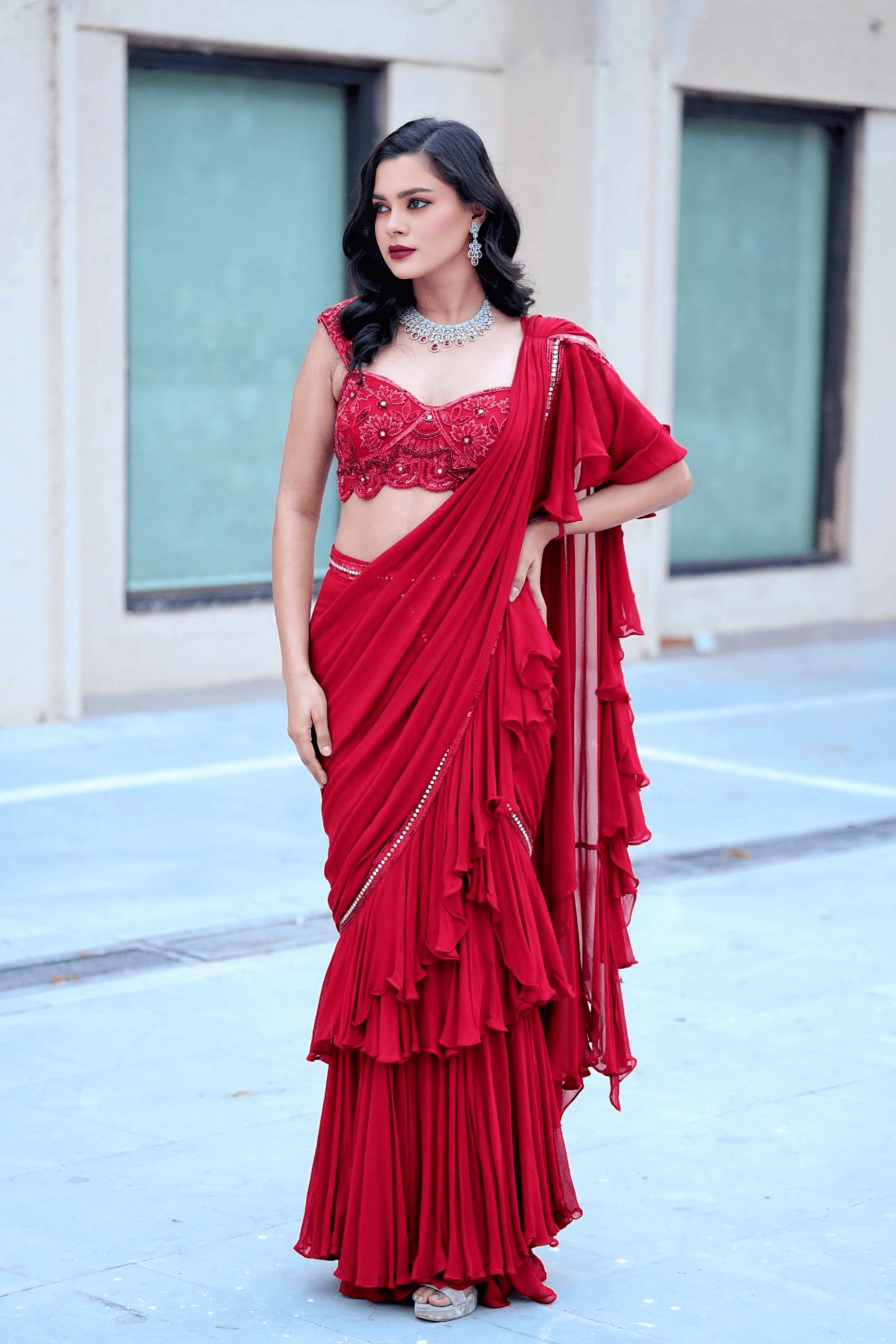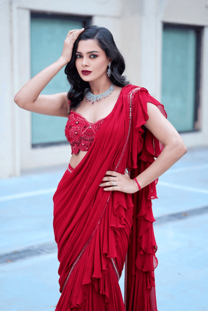 The stunning pre-draped creation in rich red. The saree features cascading ruffle detailing that adds movement and drama to every step. Paired with a fully hand-embroidered blouse adorned in intricate self-thread jaal work, this ensemble beautifully marries traditional artistry with contemporary elegance.