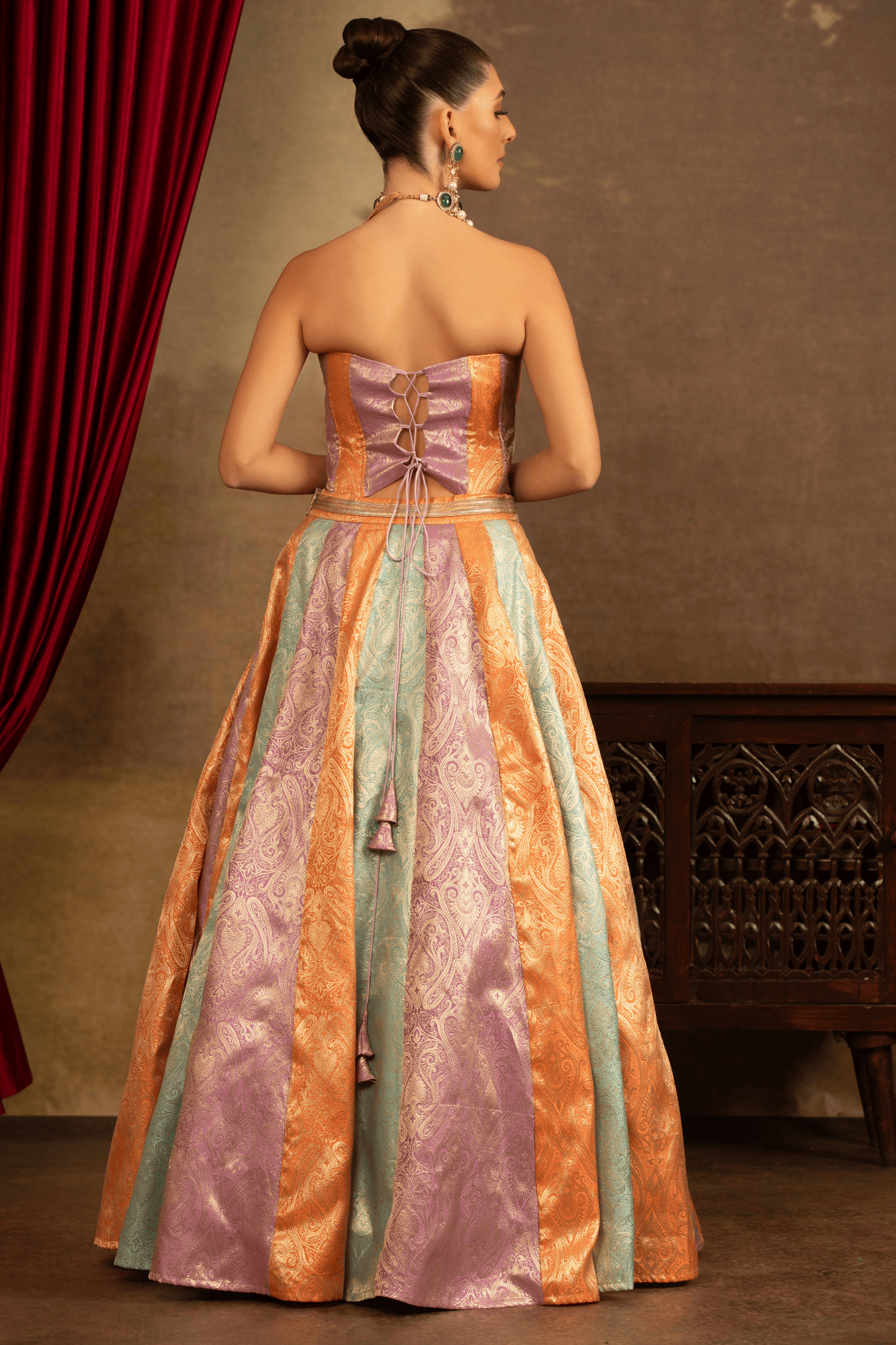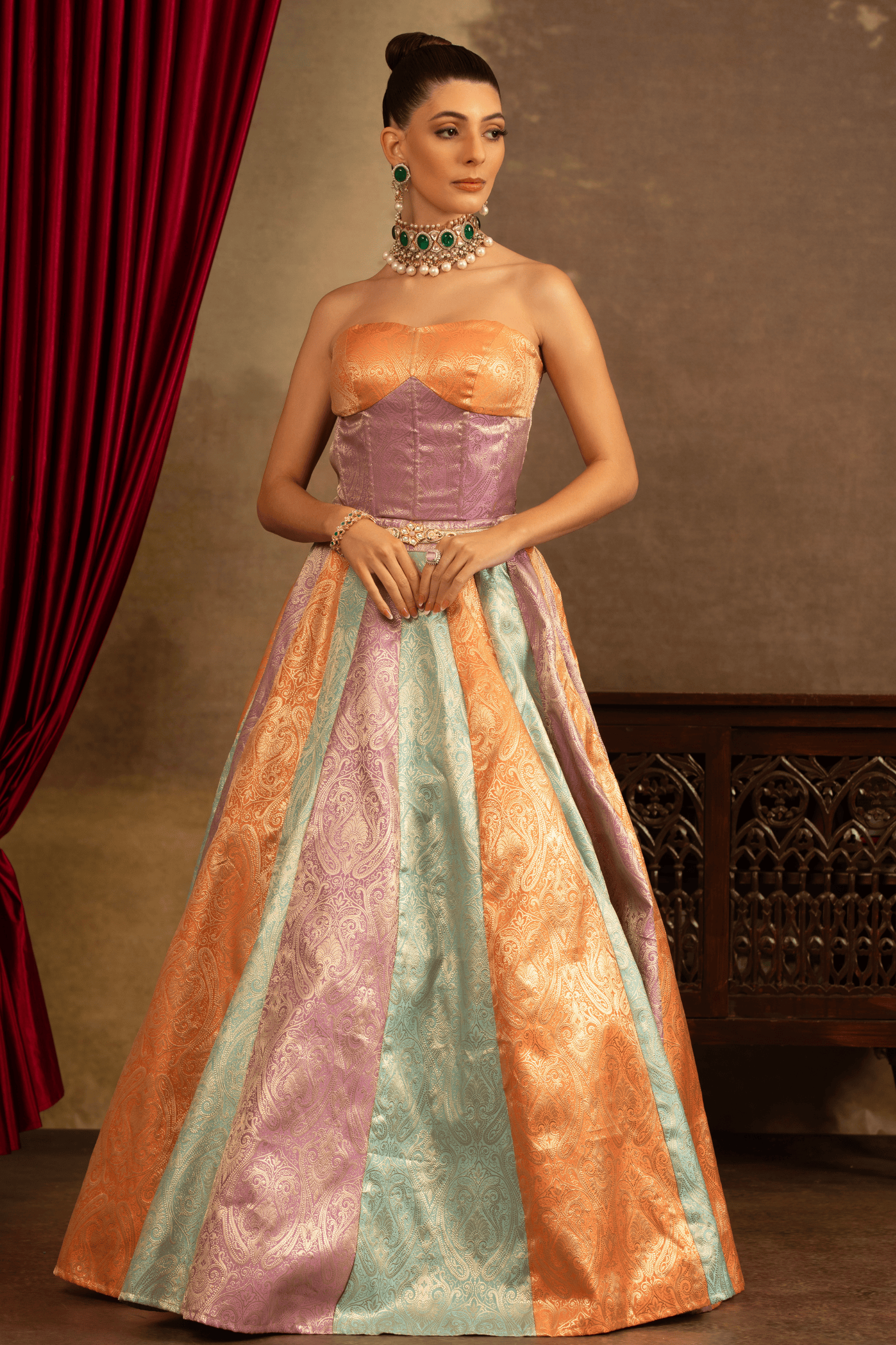 A vibrant ode to colour and craftsmanship, the Satrangi Noor Panelled Lehenga Set from the Satrangi collection by Rosy Ahluwalia is a lehenga that features striking multicolour panels in soft pastel tones of peach, mint, and lilac, each woven with intricate motifs. The look is paired with a contemporary strapless corset blouse, designed with a sculpted fit.