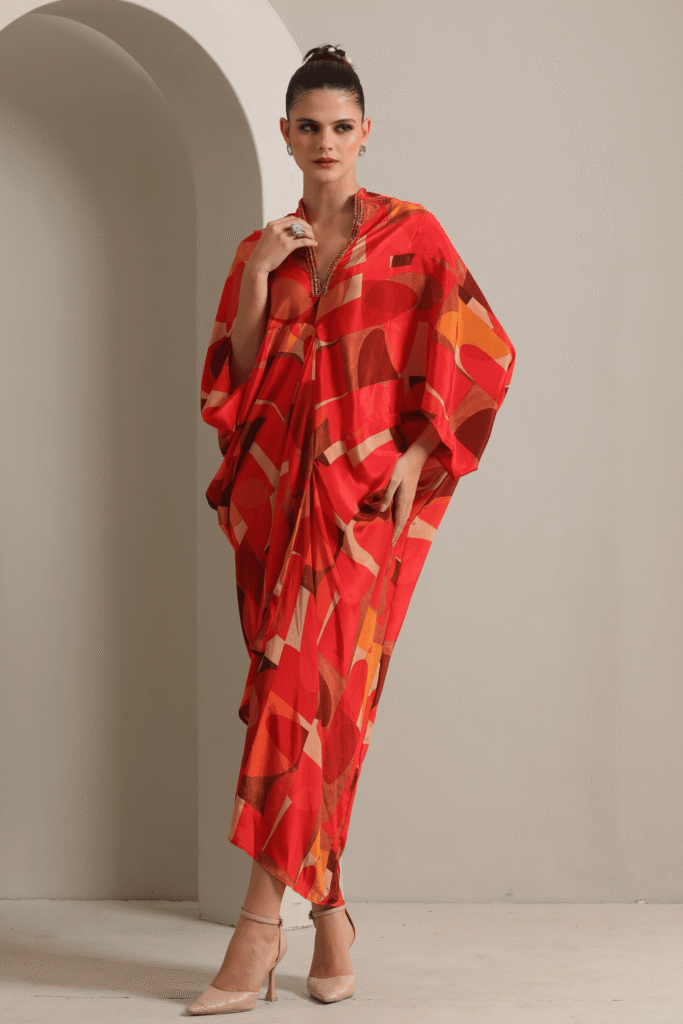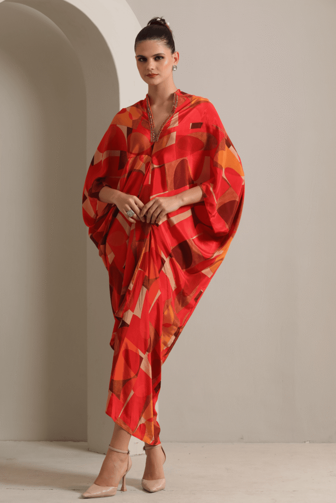 A striking blend of vibrance and elegance, the Valentina Drape Dress by Rosy Ahluwalia is crafted in a vivid printed fabric with a distinctive draped silhouette. The neckline is delicately hand-embroidered, while 3/4th sleeves add a graceful finish. Bold yet sophisticated, this dress is designed for those who love making a statement with timeless charm and modern flair.