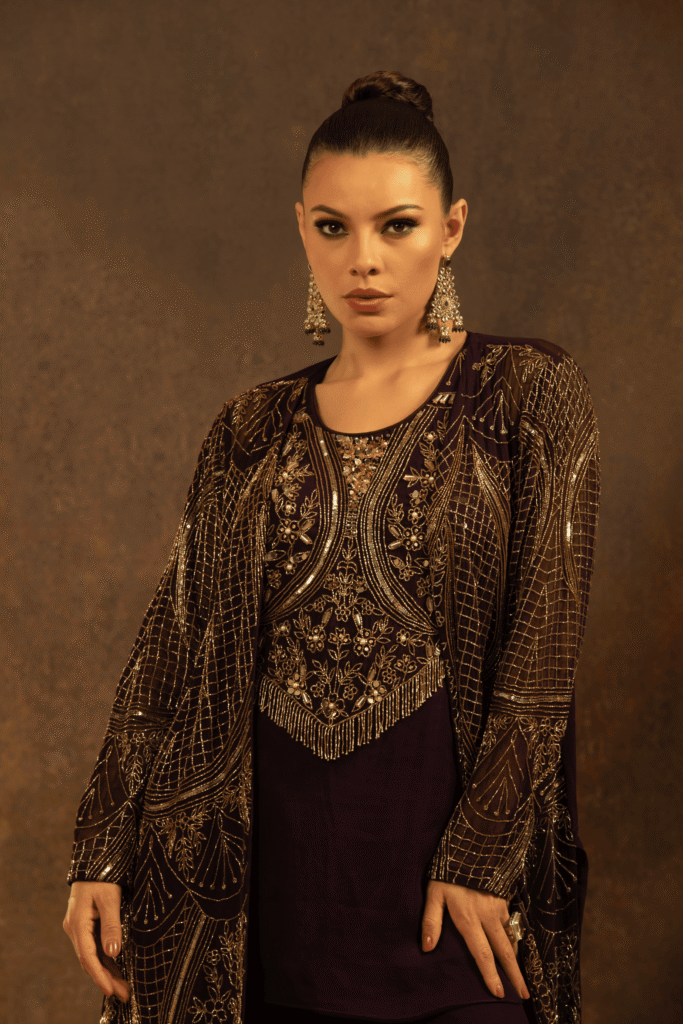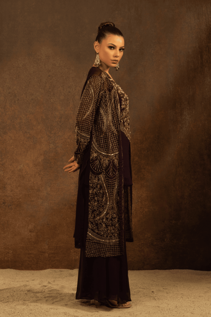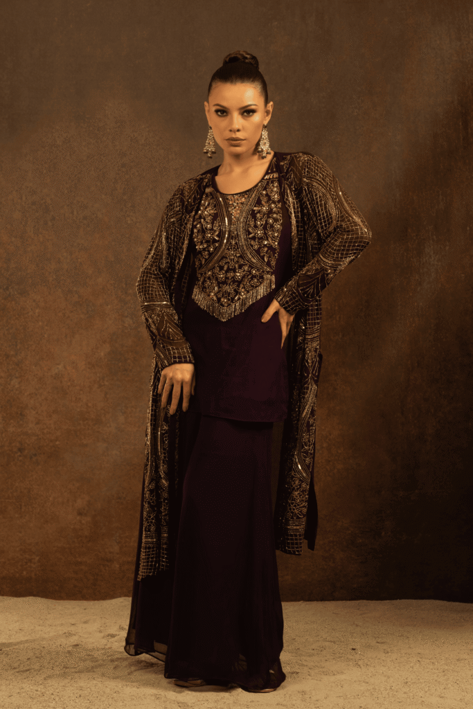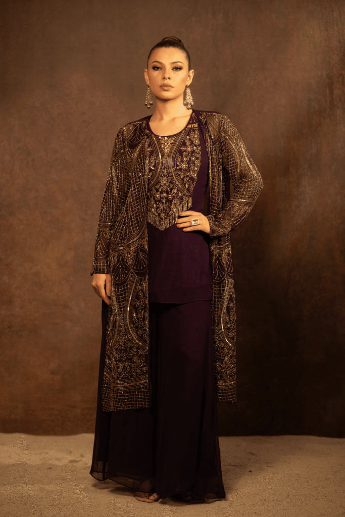 The Zarafshaan Aura Set is a statement of timeless grandeur and contemporary grace. Crafted in a deep wine-plum hue, this three-piece ensemble features a fluid inner kurta paired with palazzo pants and elevated by a richly hand-embroidered long jacket. The jacket is adorned with intricate antique gold hand embroidery, showcasing ornate floral and geometric motifs layered with fine lines of threadwork and subtle shimmer, creating a regal lattice effect.