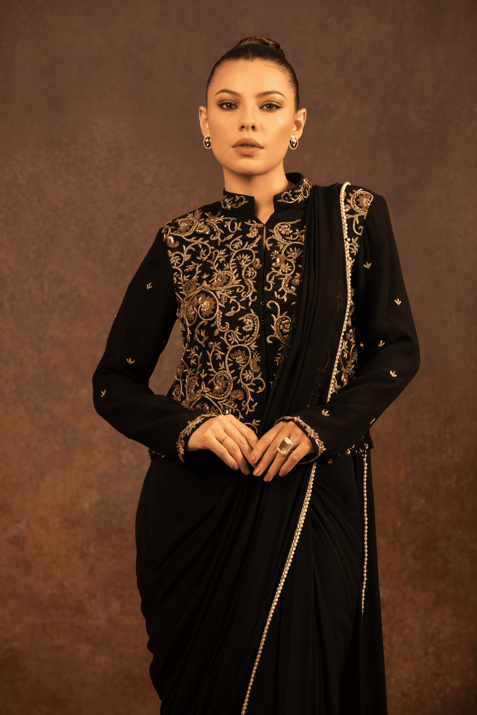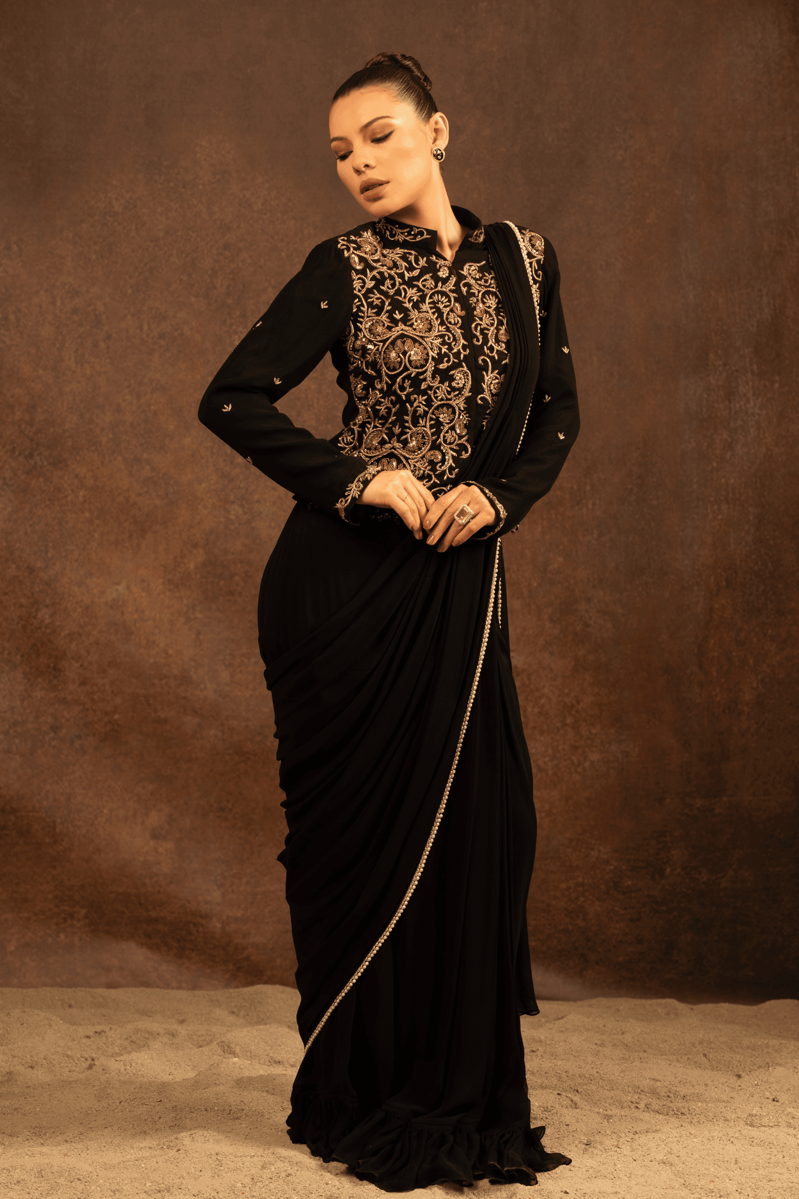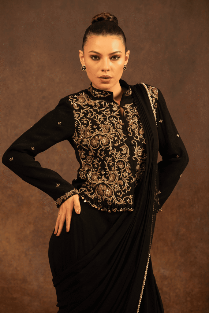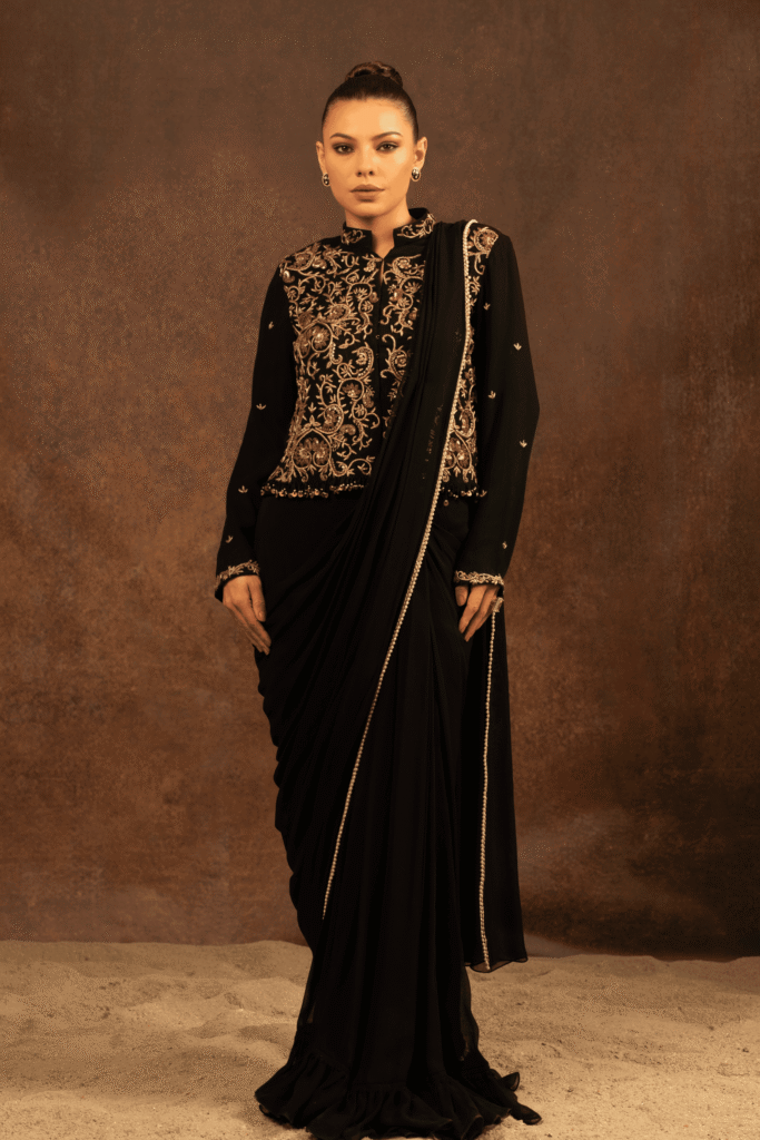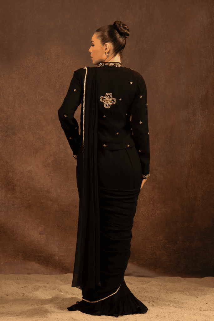 This black saree is crafted for evenings steeped in tradition and quiet power. The fluid georgette base drapes gracefully, creating a soft, sculpted silhouette that flatters with effortless ease.The blouse is richly adorned with intricate hand embroidery, where antique gold zari weaves. Delicate embroidered accents extend onto the sleeves, while a subtle beaded finish along the hem lends a refined touch of opulence.The saree is finished with an embellished border.