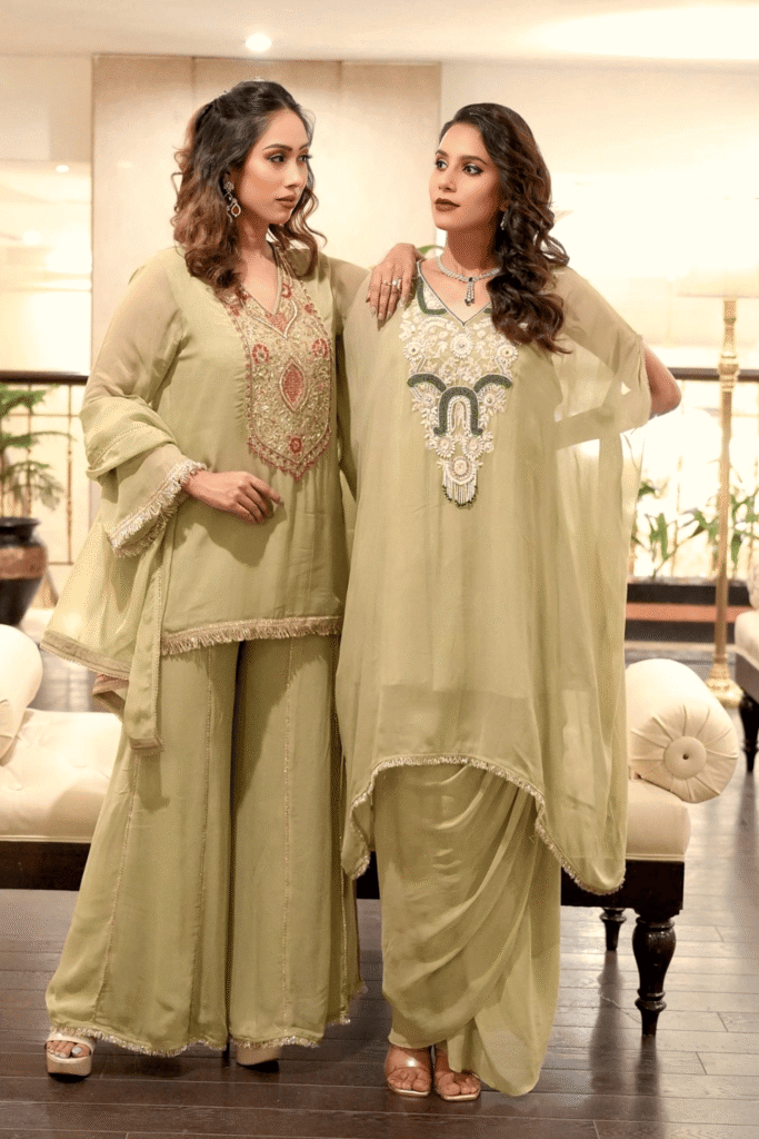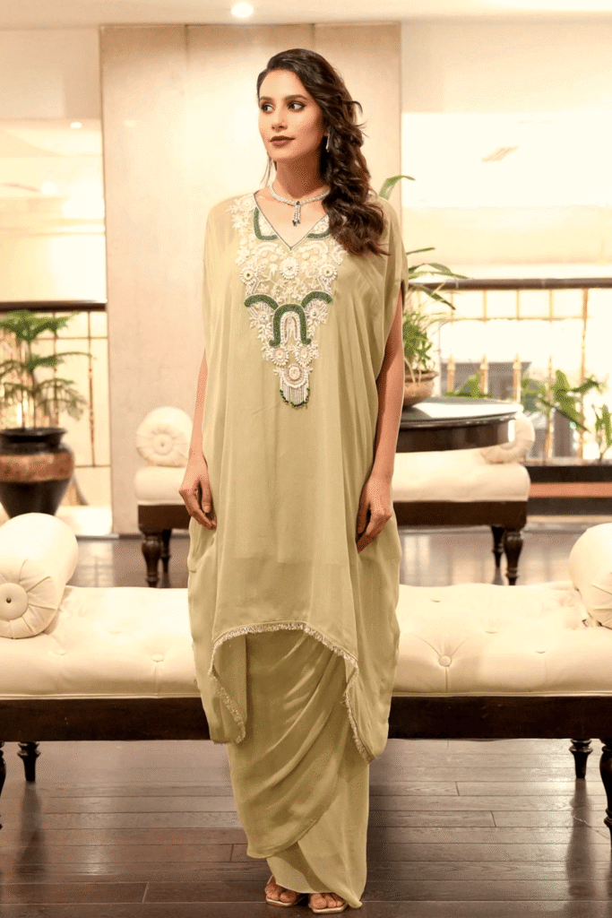 The Zarreen Dhoti Set in rich olive green redefines understated elegance. Crafted in soft, flowy fabric, the kaftan-style top features intricate hand-embroidered moti work accented with dark green beads for a subtle contrast. Finished with a delicate kinari lace trim along the hem and paired with a pre-draped dhoti, this ensemble perfectly blends festive detailing with effortless sophistication.