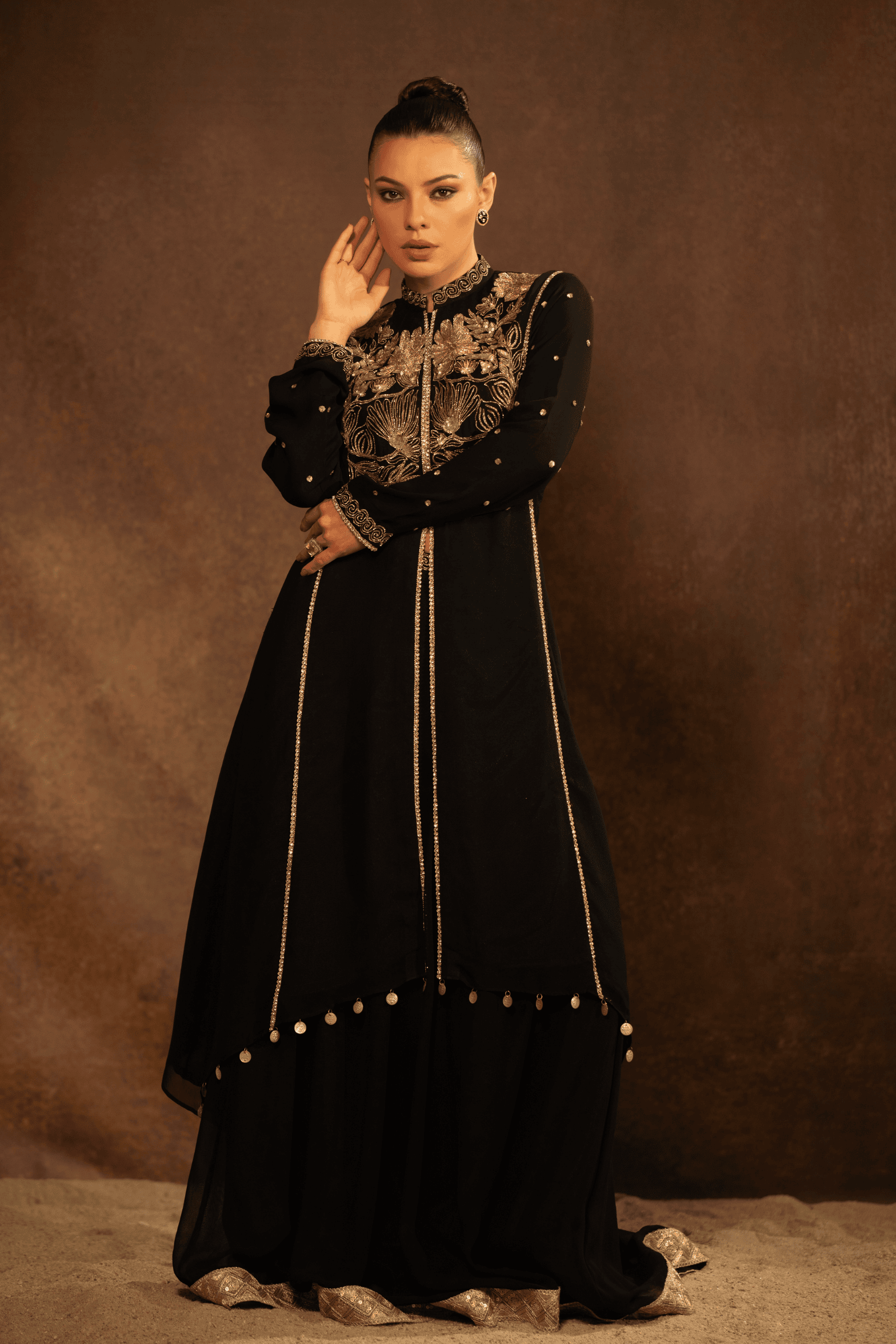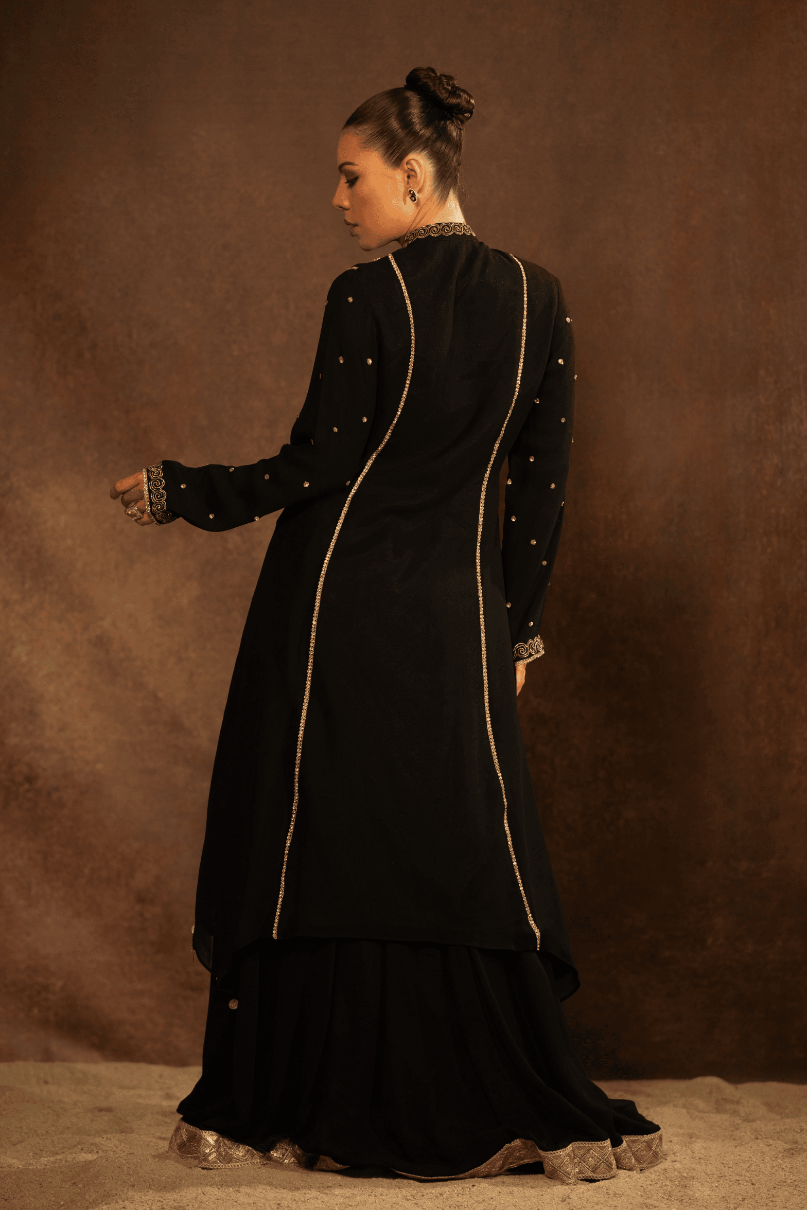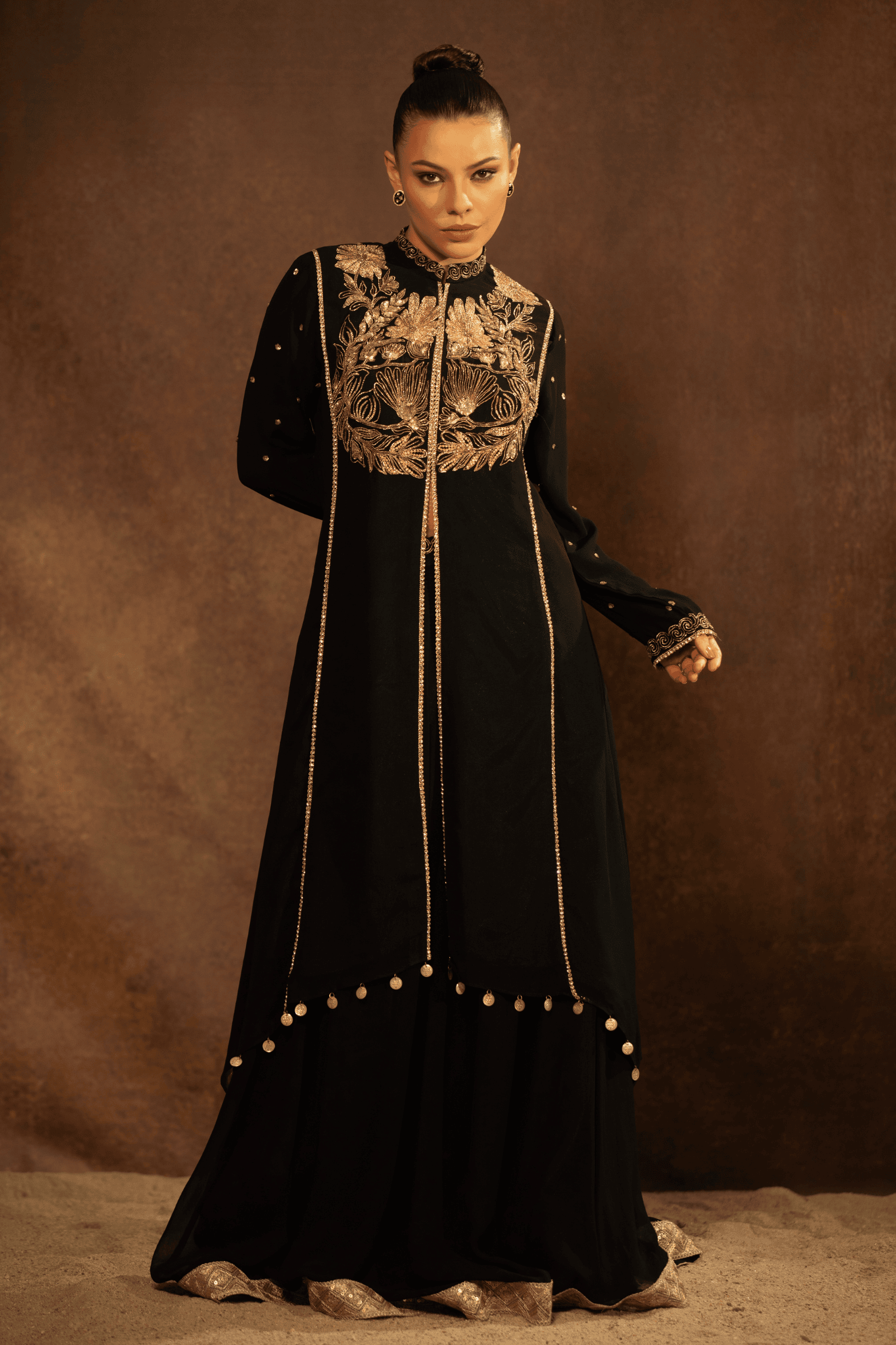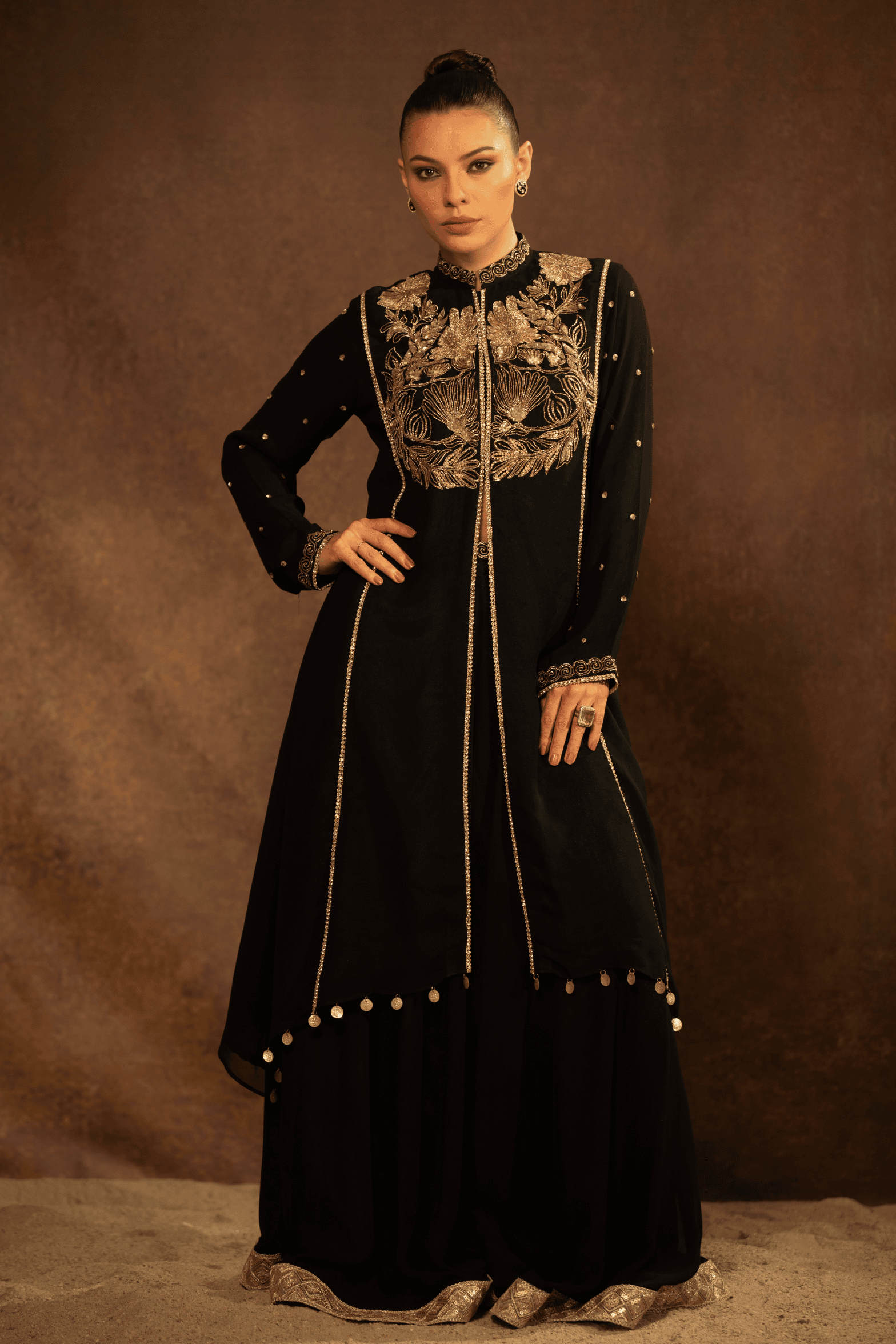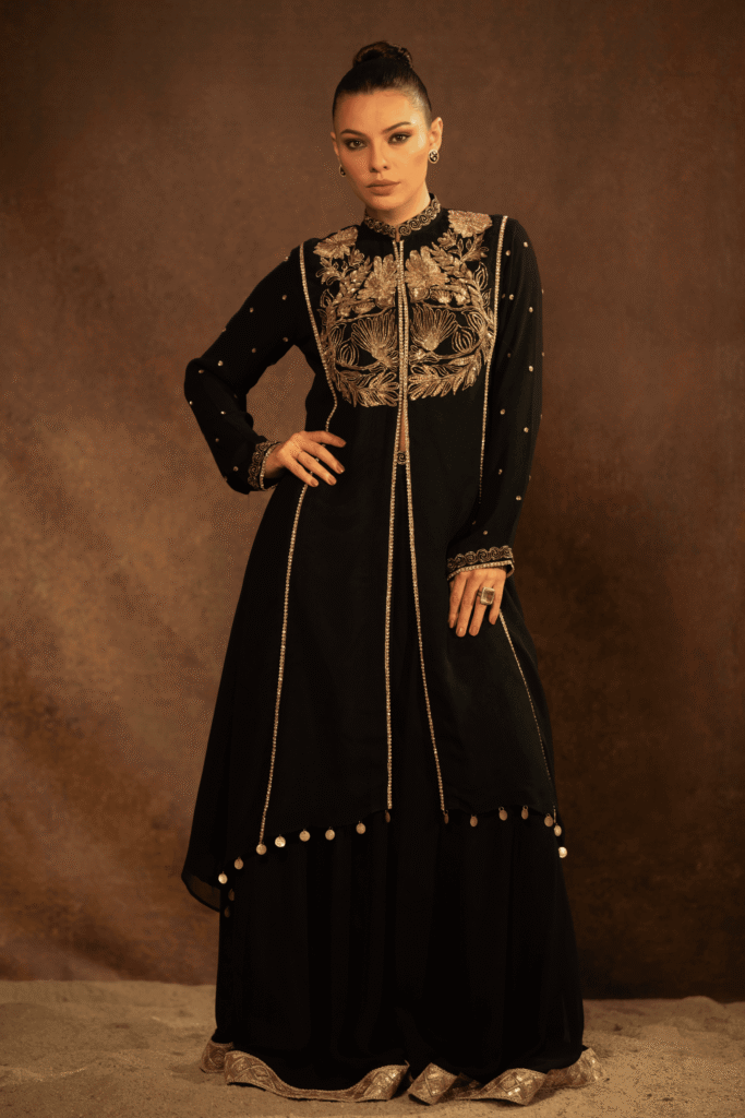 The Zehra Noir Kurta Set is a timeless expression of elegance, crafted for evenings that call for understated grandeur. Rendered in deep black, the kurta features intricate hand embroidery across the bodice, highlighted with antique gold zari work forming floral and heritage-inspired motifs. The neckline and front panel are delicately finished with fine detailing, adding depth and structure to the silhouette.