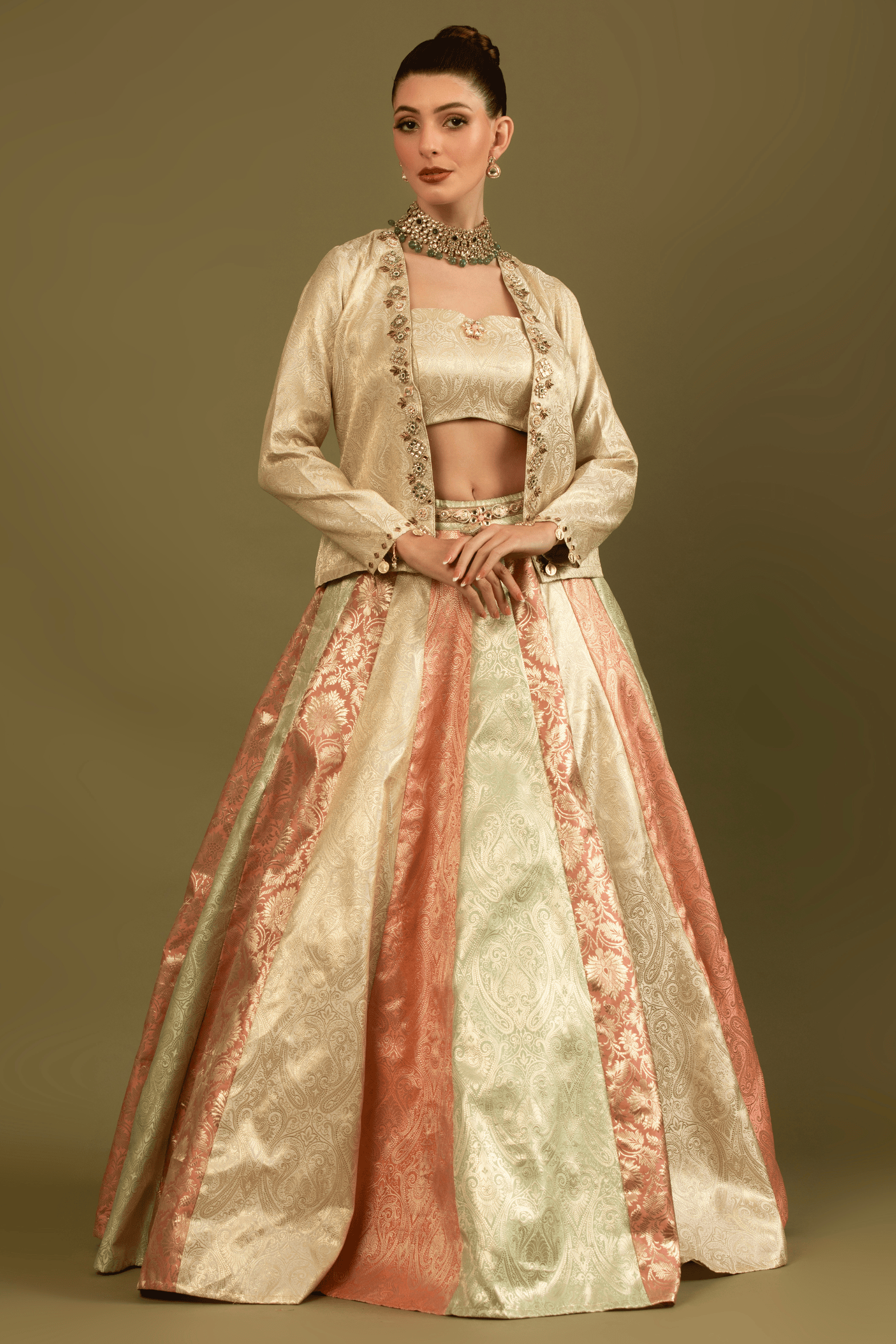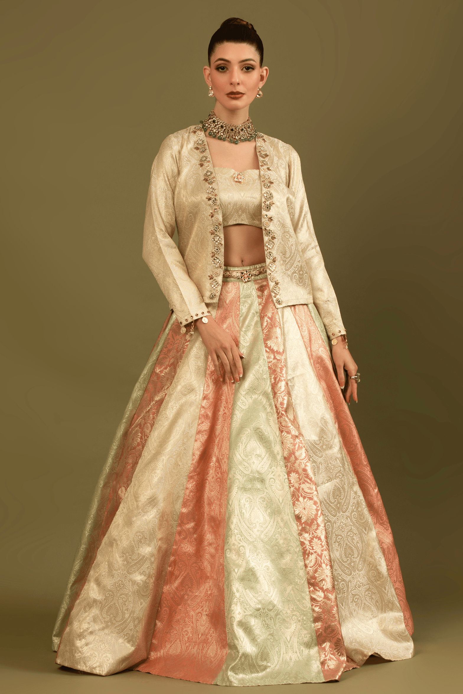 The Zivara Jacket Lehenga Set is a ensemble that features a structured blouse paired with a delicately tailored jacket, adorned with intricate hand-embellished detailing along the neckline and edges. The voluminous panelled lehenga is designed in soft pastel tones, woven with traditional motifs that create a subtle interplay of texture and sheen. Each panel flows gracefully, offering movement and grandeur while maintaining a balanced, elegant silhouette.